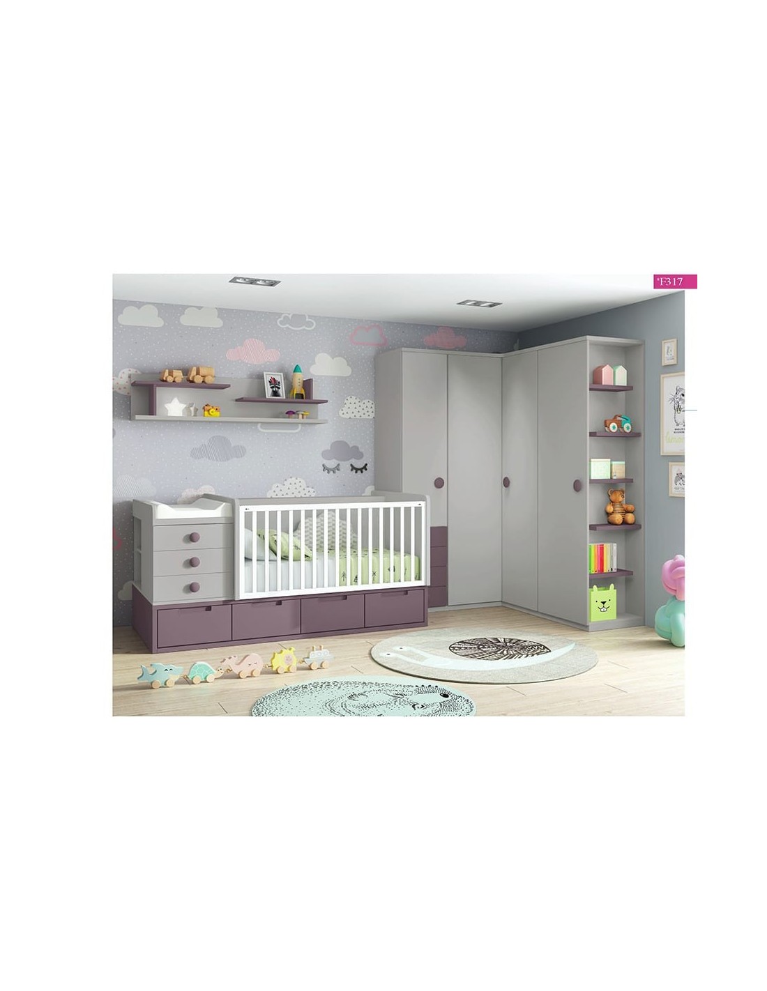 Dormitorio bebe cuna nido compacto armario madera moderno lila