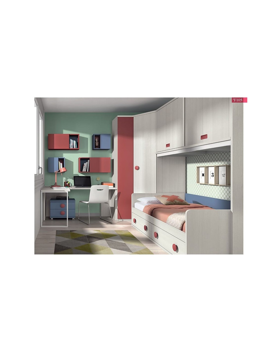 Dormitorio juvenil cama nido cajones armario madera escritorio moderno rojo