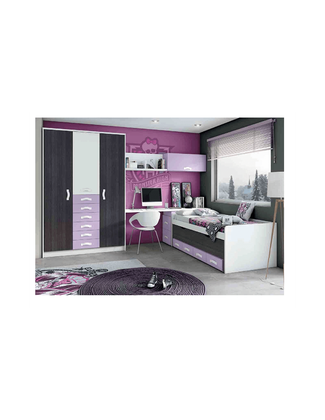 Dormitorio juvenil cama nido compacta cajones escritorio armario madera moderno lila negro
