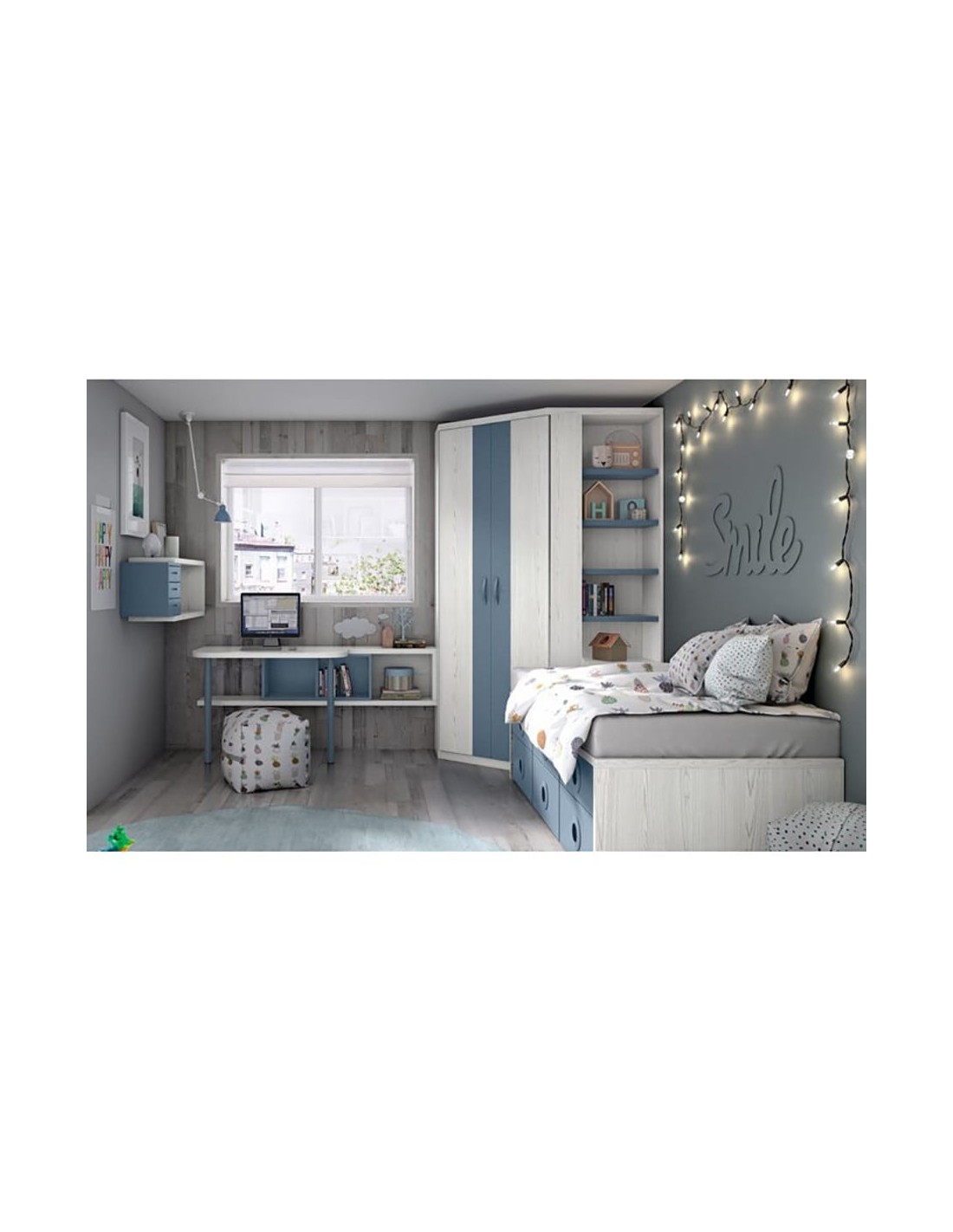 dormitorio juvenil con cama nido compacto modular cajones madera moderno armario azul