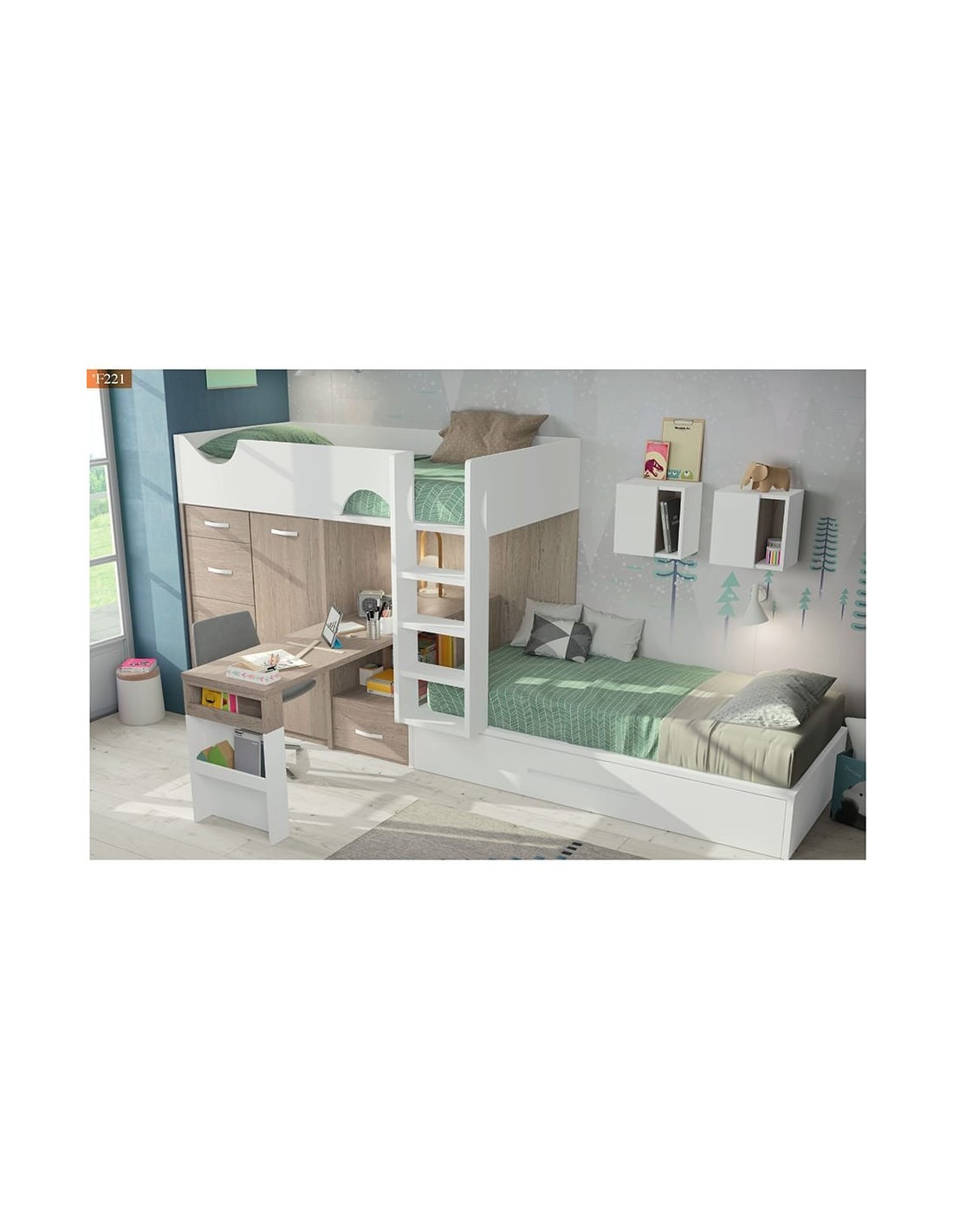 Dormitorio juvenil litera tren armario madera moderno escritorio extraible