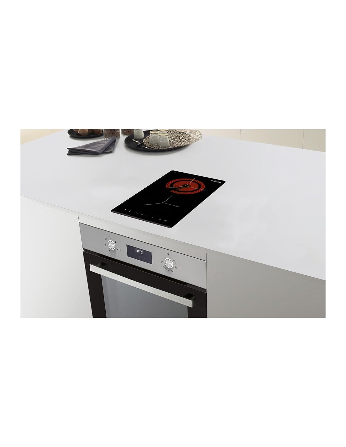 La Edesa EVT-3220BB es una placa vitrocerámica compacta de 29 cm con dos zonas de cocción (una simple y una doble), control táctil, 9 niveles de potencia, funciones de seguridad como bloqueo y avisador de calor residual, ideal para cocinas pequeñas con estilo.