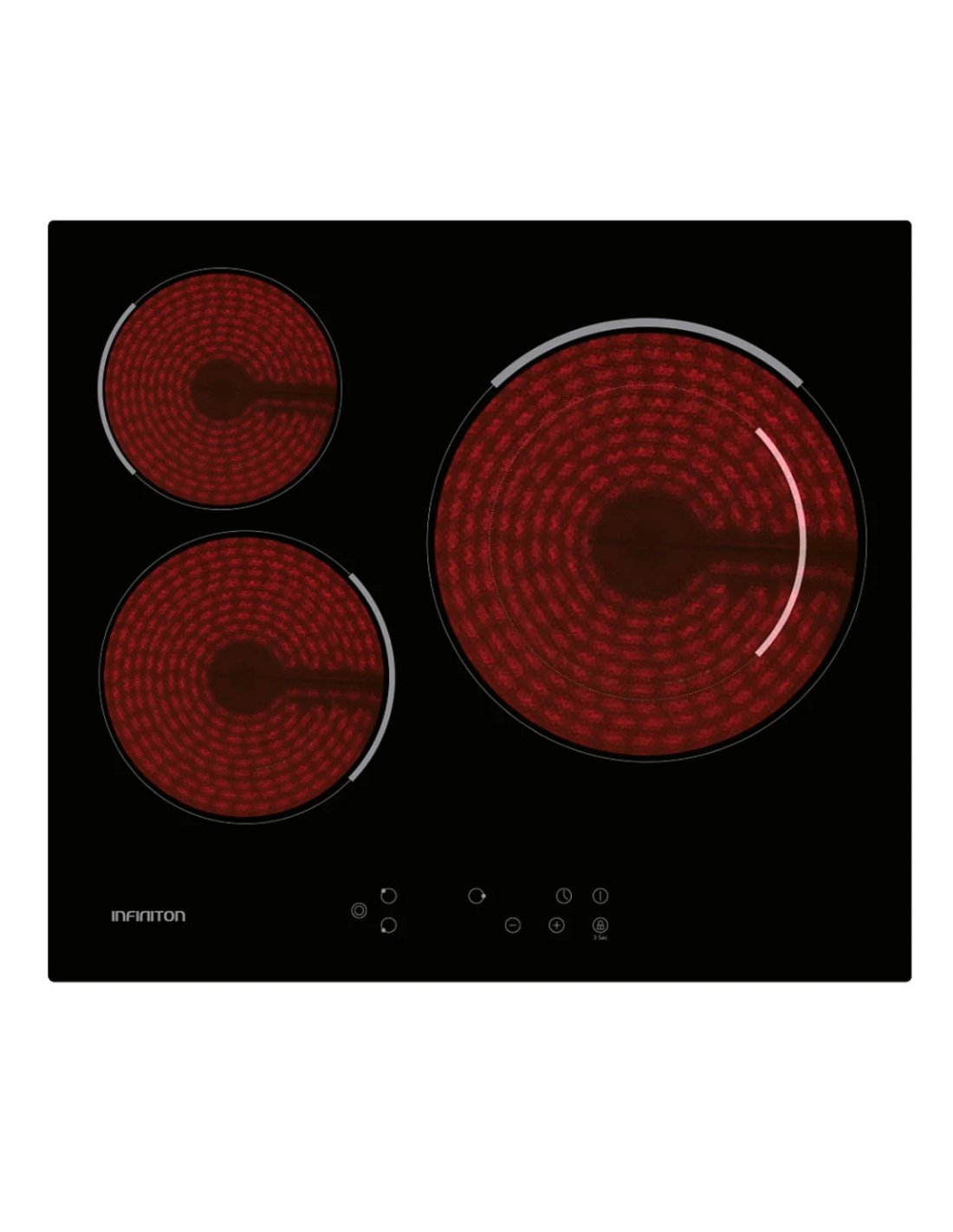La placa Infiniton VIT3P54W es una vitrocerámica elegante de 60 cm con tres zonas de cocción, panel táctil y múltiples niveles de potencia.