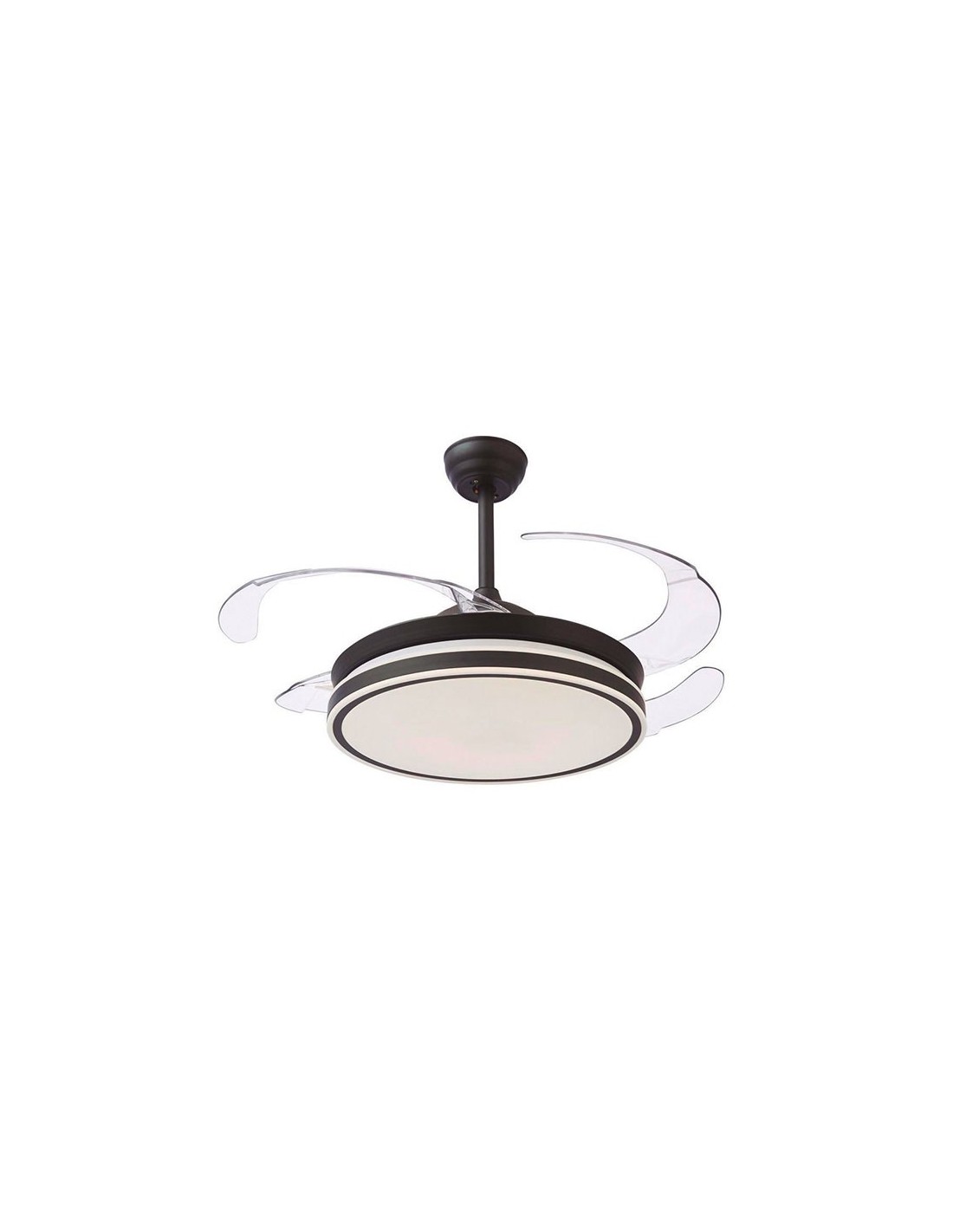 Ventilador COCON con luz, 4 aspas retráctiles transparentes y motor DC con 6 velocidades. Este modelo incluye - mando a distancia, - modo Verano y Invierno, - función de memoria, - temporizador 1/2/4h - temperatura de luz ajustable. Tecnología LED integrado con una potencia de 72 wattios, 6480 lúmenes y 3 colores de luz 3000|4000|6000K. Tiene una medida de Al.35xD.108cm (D.50 cm con las aspas retraídas)