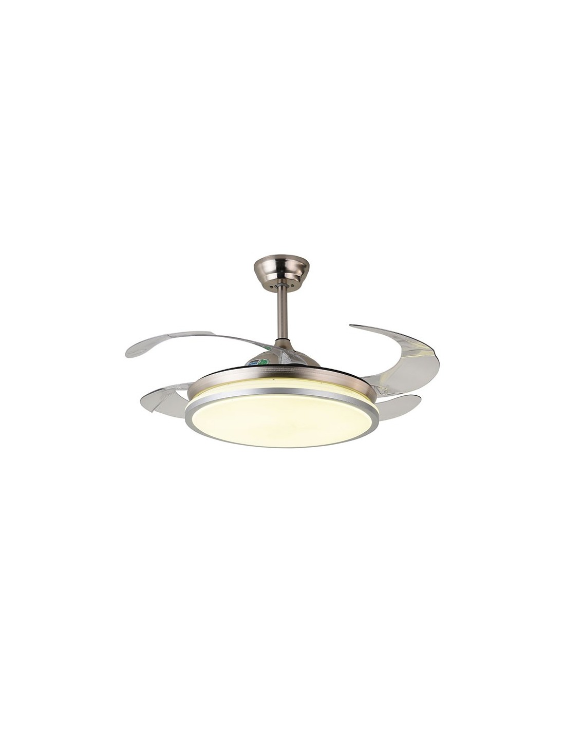 Ventilador DUNE con luz, 4 aspas retráctiles transparentes y motor DC con 6 velocidades. Este modelo incluye - mando a distancia, - modo Verano y Invierno, - función de memoria, - temporizador 1/2/4h, - regulación de intensidad, - temperatura de luz ajustable. Tecnología LED integrado con una potencia de 72 wattios, 6480 lúmenes y 3 colores de luz 3000|4000|6000K. Tiene una medida de Al.35xD.108cm (D.50 cm con las aspas retraídas)