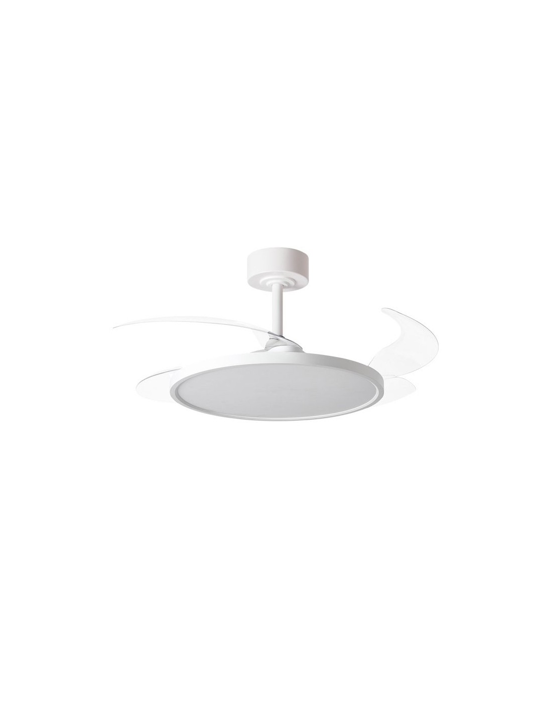 Ventilador SLIM con luz, 4 aspas retráctiles transparentes y motor DC con 6 velocidades. Este modelo incluye - mando a distancia, - modo Verano y Invierno, - temporizador 1/2/4h, - temperatura de luz ajustable. Tecnología LED integrado con una potencia de 72 wattios, 6480 lúmenes y 3 colores de luz 3000|4000|6000K con conbinación de color de la luz. Tiene una medida de Al.35xD.108cm (D.50 cm con las aspas retraídas)