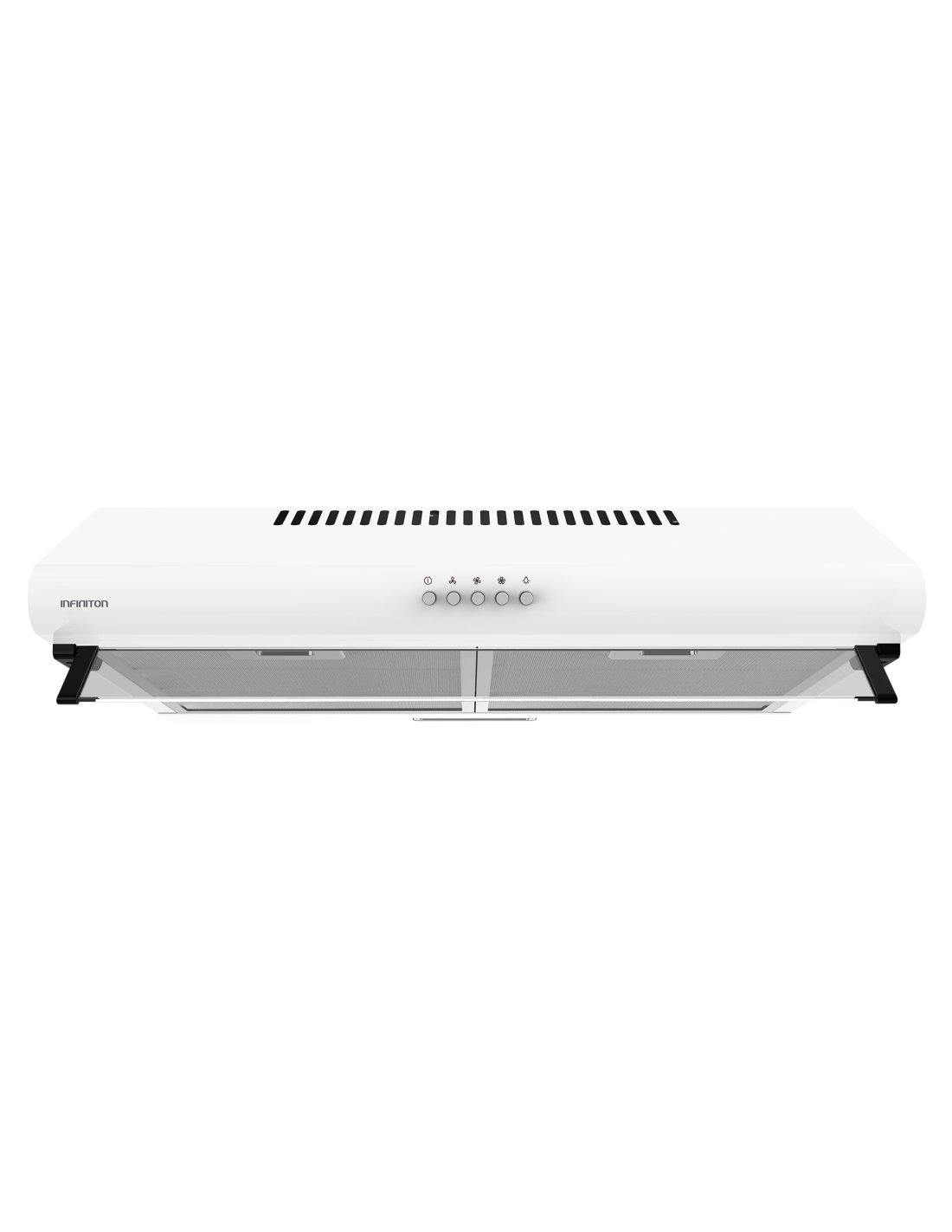 La campana con visera Infiniton CMPV‑632BC14 combina un diseño compacto con capacidad de extracción de 320 m³/h, tres niveles regulables, luz LED integrada y filtros metálicos lavables.