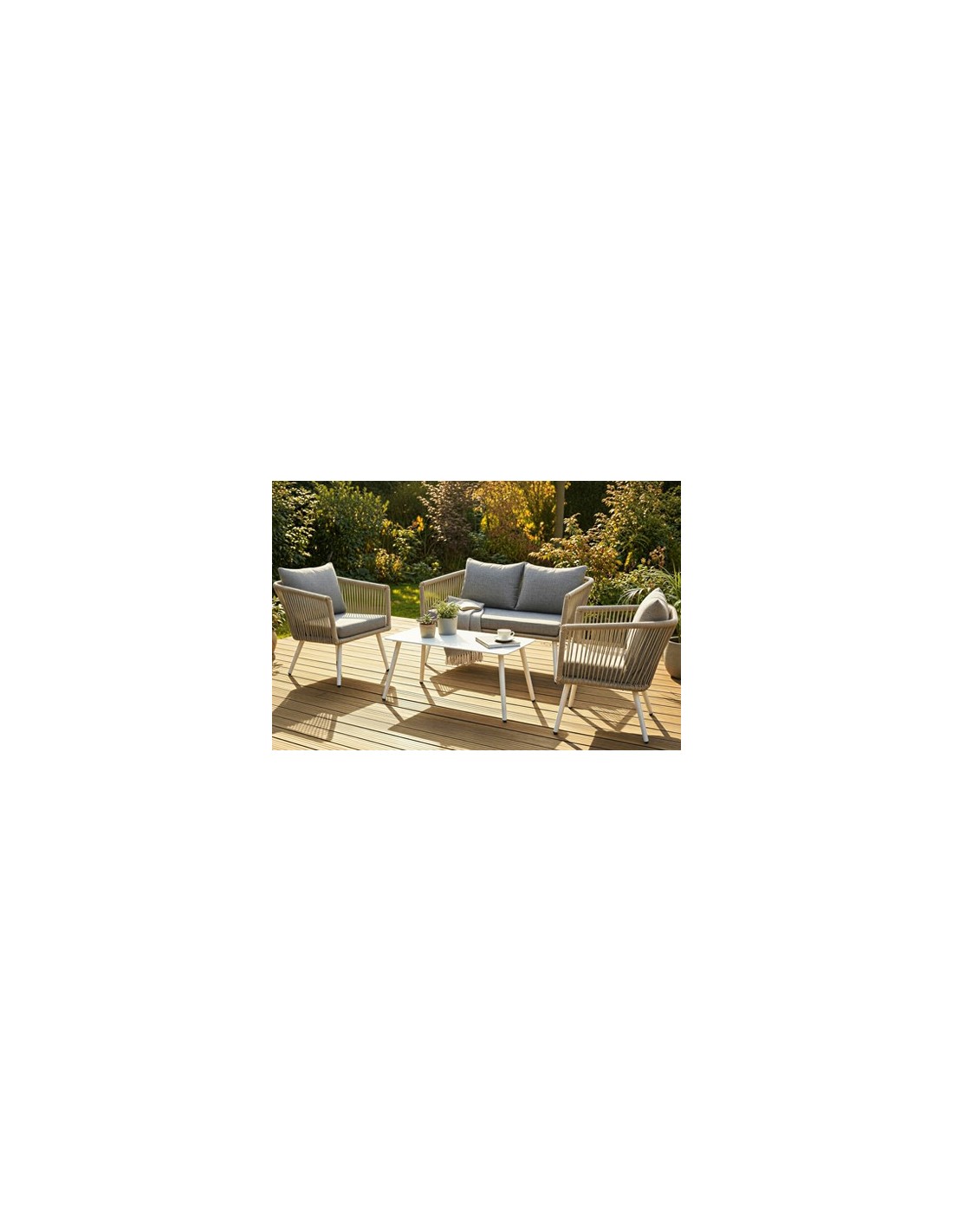 Conjunto de exterior Compuesto por 1 sofá 2 plazas, 2 sillones 1 plaza y mesa de centro Estructura en aluminio Rattán sintético Cojines en tejido de poliester Tapa mesa en cristal templado Sofa 2 pl : 136 x 71 x 69 cm Sillón 1 pl : 62 x 71 x 69 cm Mesa centro : 90 x 50 x 42 cm - Unidad venta : caja 1 Ud - Volumen : 0 634 M 3 x Ud Entradas previstas : Colores disponibles : Rattán marron En stock : 124 Uds En stock : 124 Uds