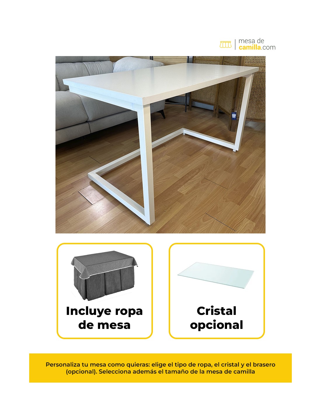 Mesa camilla de forja color blanco. Tamaños disponibles: 120x70 cm, 130x80 cm y 140x80 cm, todas con una altura de 73 cm.