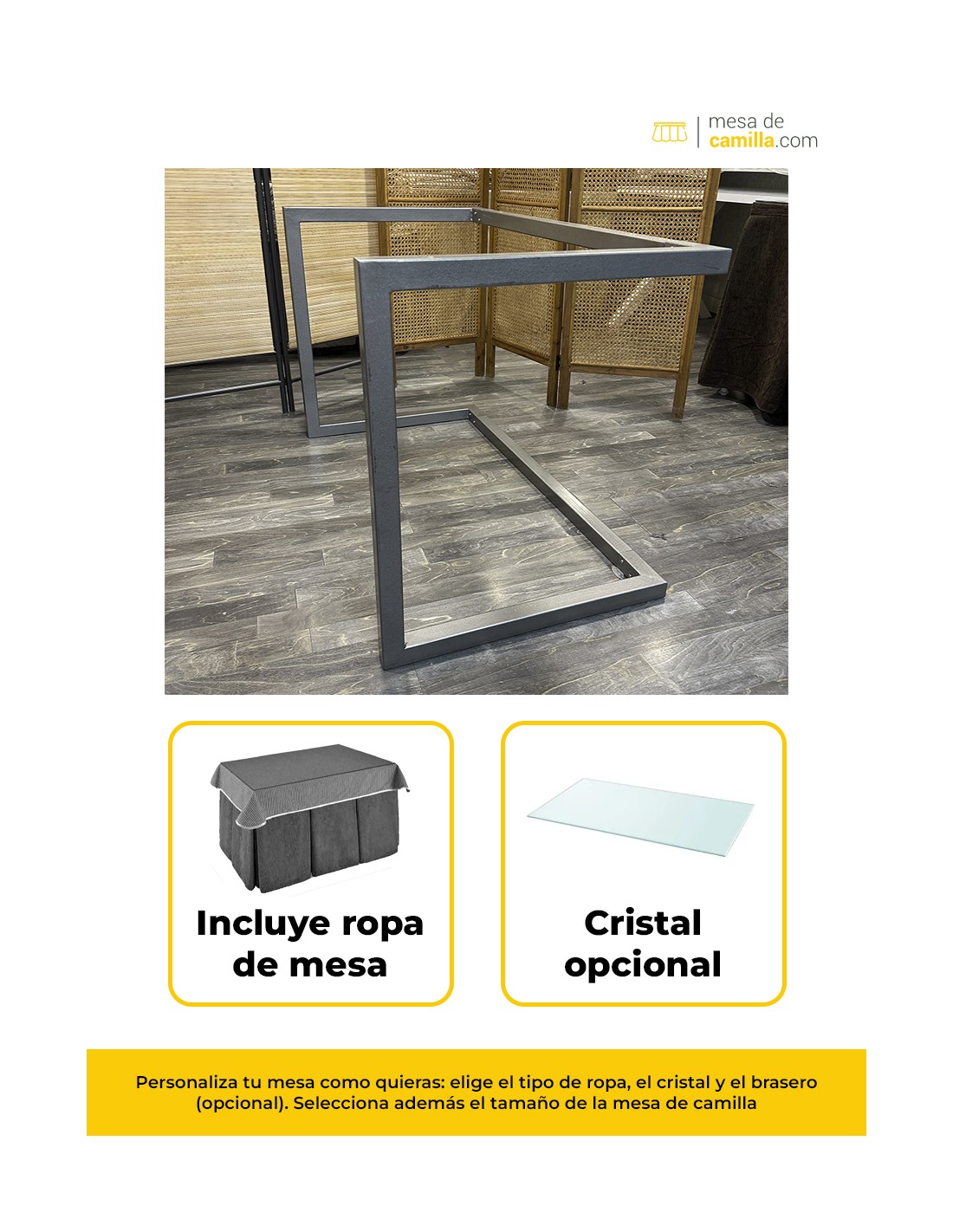 Esta mesa camilla de forja es un modelo especial confort, ya que al tener libre los laterales y tener "forma de C", podrás utilizarla en conjunto con sofás reclinables y no tropezar con las esquinas. Es un modelo muy cómodo, perfecto para sofás grandes y ahorrar en espacio.