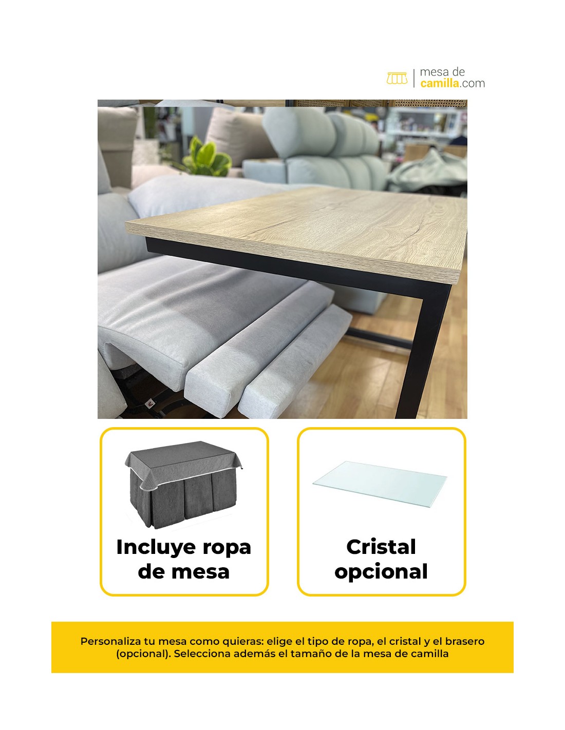 Esta mesa camilla de forja es un modelo especial confort, ya que al tener libre los laterales y tener "forma de C", podrás utilizarla en conjunto con sofás reclinables y no tropezar con las esquinas. Es un modelo muy cómodo, perfecto para sofás grandes y ahorrar en espacio.