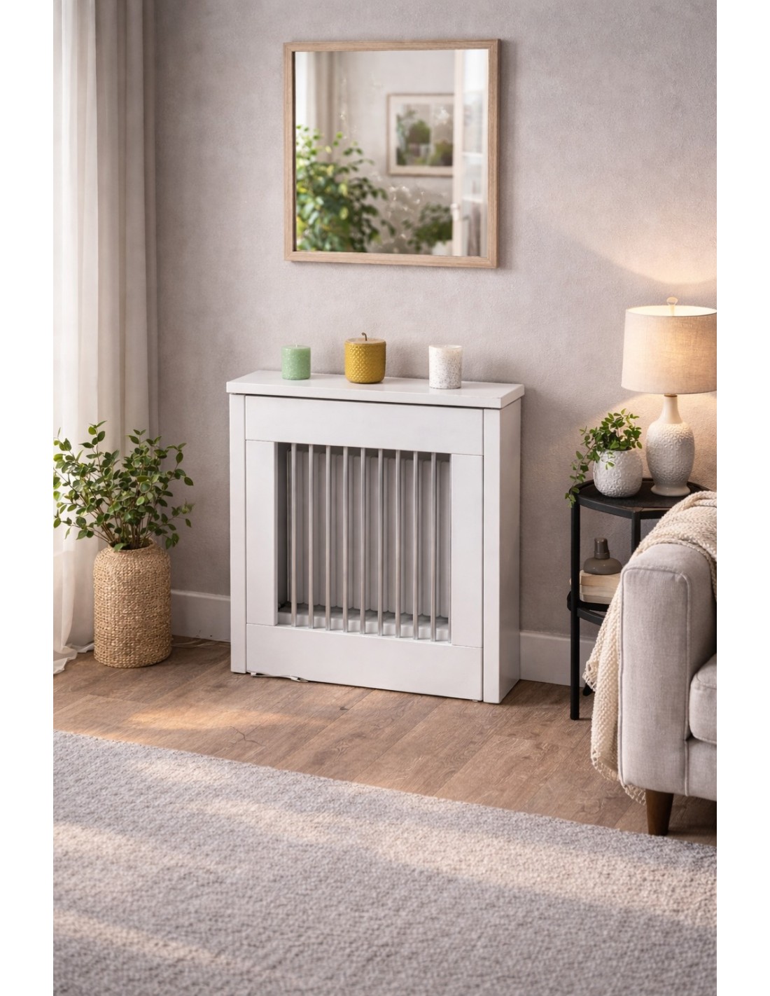 Este cubreradiador de líneas modernas es la solución ideal para ocultar radiadores de forma estética sin perder eficiencia térmica en el hogar. Su frontal de barras verticales permite una circulación de aire fluida y constante, transformando un elemento técnico en una pieza decorativa funcional y segura. Es el complemento perfecto para salones o recibidores que buscan un acabado limpio, luminoso y totalmente integrado en la decoración.