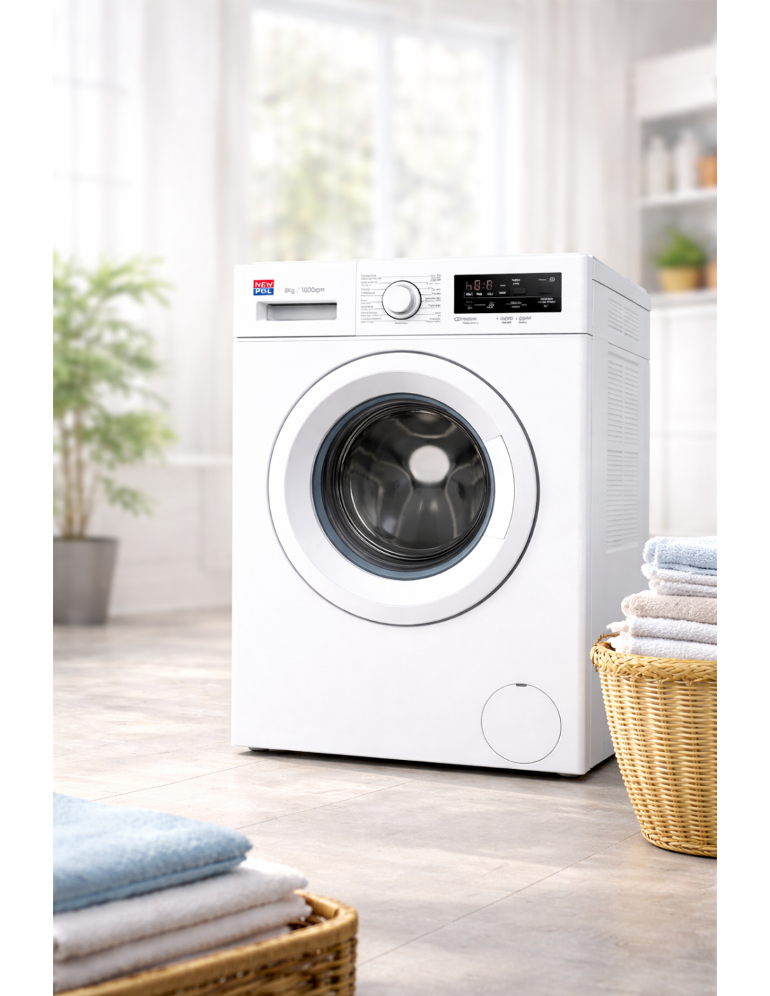 La Lavadora New Pol NWT0810 de carga frontal ofrece una capacidad de 8 kg y una velocidad de centrifugado de 1000 rpm, adaptándose a las necesidades diarias del hogar.
