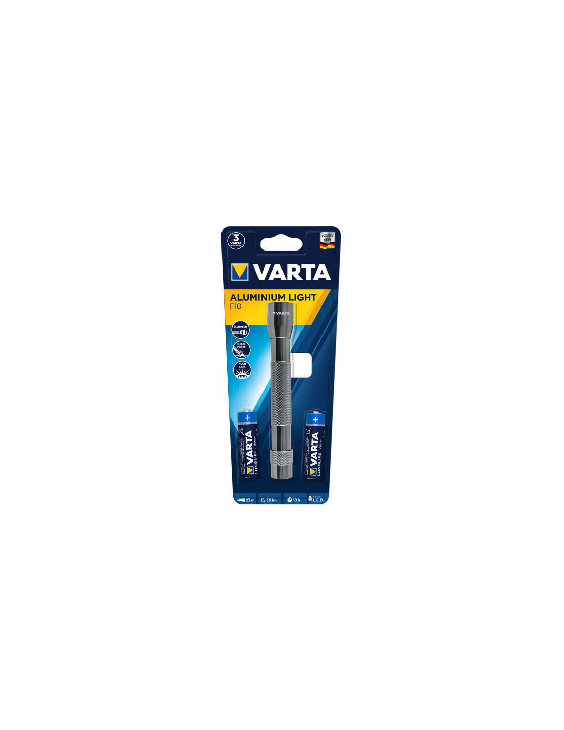 Linterna VARTA Aluminium F10 Material super resistente y fabricado en aluminio con 5 LEDs de 5 mm para una mejor iluminación. Diseño elegante y robusto. Material grip para un mejor agarre. Pilas AA LR06 incluidas.