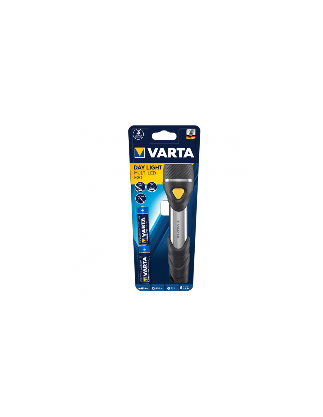 Linterna LED Varta. Posee una carcasa de tres componentes (acero inoxidable, goma y plástico ABS), la luz es especialmente resistente. Es ideal tanto para salir a correr y hacer excursiones, así como para su uso en coches, cobertizos, garajes, en casa o para trabajos de reparación y construcción. Linterna de 9 leds de 5 mm con tecnología multiled. La potencia lumínica es de hasta 40 lúmenes y el alcance es de hasta 29 metros. Dispone de un asa antideslizante revestida de goma y una correa para un agarre cómodo y seguro en cualquier situación. pilas LR06 incluidas.