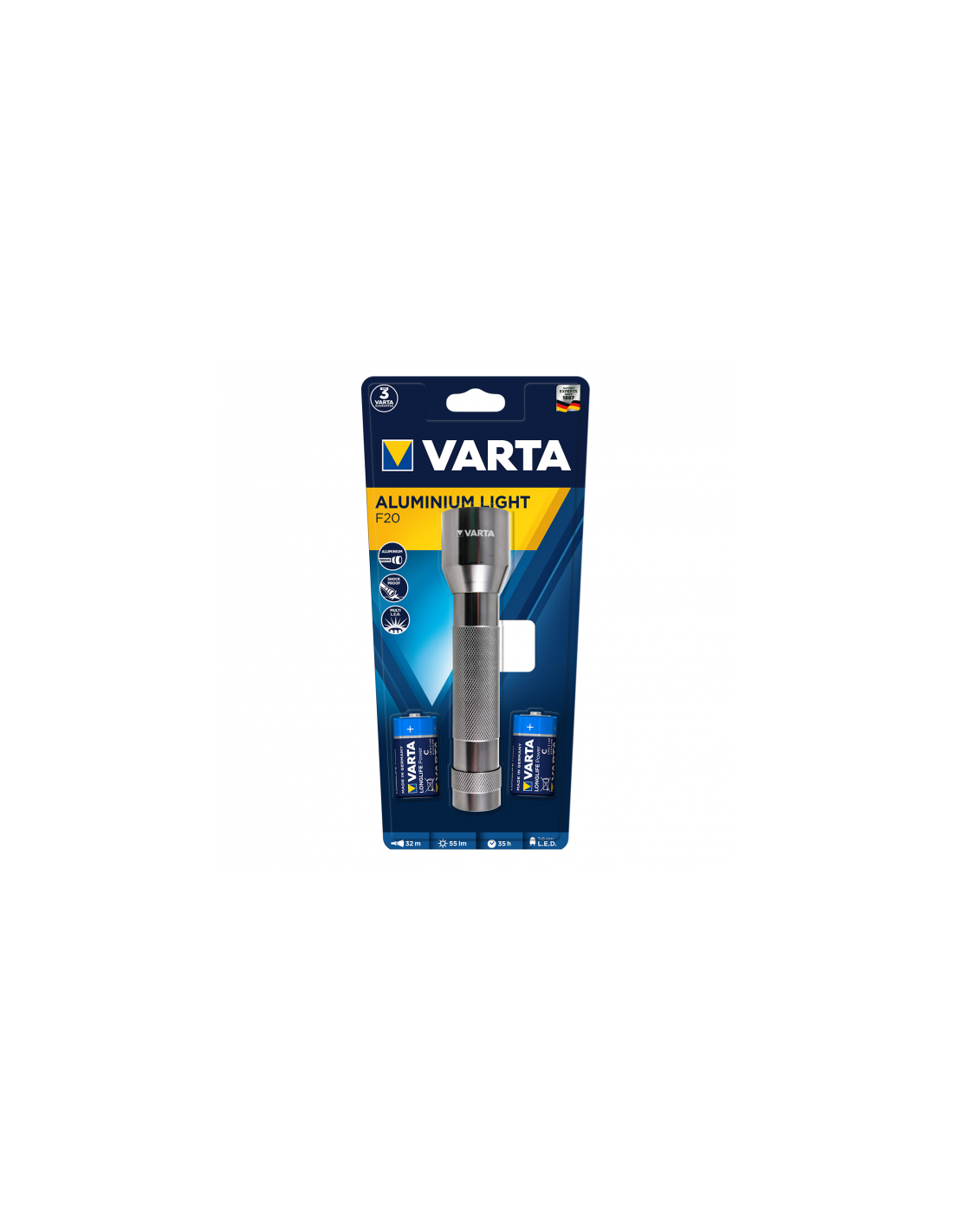 Linterna VARTA Aluminium F20 de material super resistente y fabricado en aluminio. Posee 7 LEDs de 5 mm para una mejor iluminación. Diseño elegante y robusto. Material grip para un mejor agarre. Pilas LR14 incluidas.