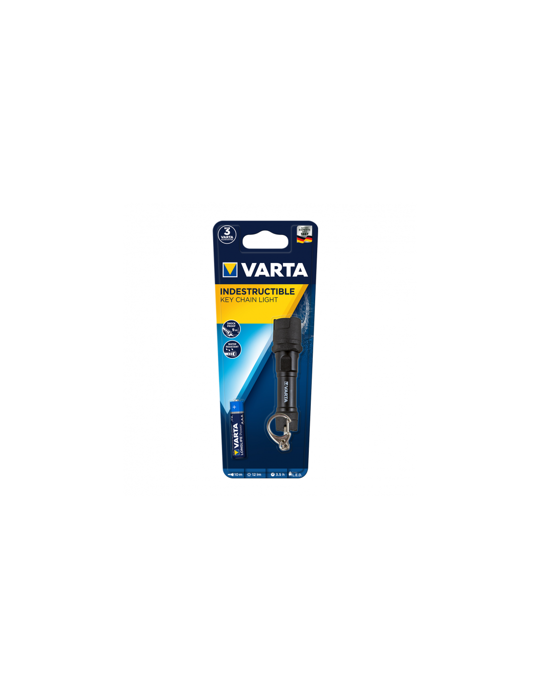 Linterna LEd Varta de color negro. Posee un color de luz blanca de 5 mm para mejor iluminación.Muy robusta robusta (resiste a un test de caída de 9 mts). Resistente al agua de acuerdo a la norma IPX4. Utiliza una pila AAA LR03 incluida. Cabezal y tapa posterior de caucho para conseguir máxima durabilidad.Tiene una potencia total de alumbrado de 12 lúmenes y unja duración de 3,5 horas. Incluye llavero.