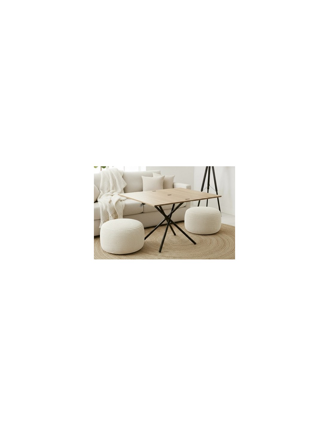 Mesa centro elevable y extensible Tapa en melamina Extensible tipo libro a 114 x 100 cm Elevacíon a gas Accionamiento mediante tirador Estructura metálica color negro Medidas : 100 x 57 - 114 x 38 - 76,5 cm - Unidad venta : caja 1 Ud - Volumen : 0 131 M 3 x Ud Entradas previstas : 191 Ud(s) - 29/03 Colores disponibles : Oak / Negro 191 Ud(s) - 29/03 191 Ud(s) - 29/03