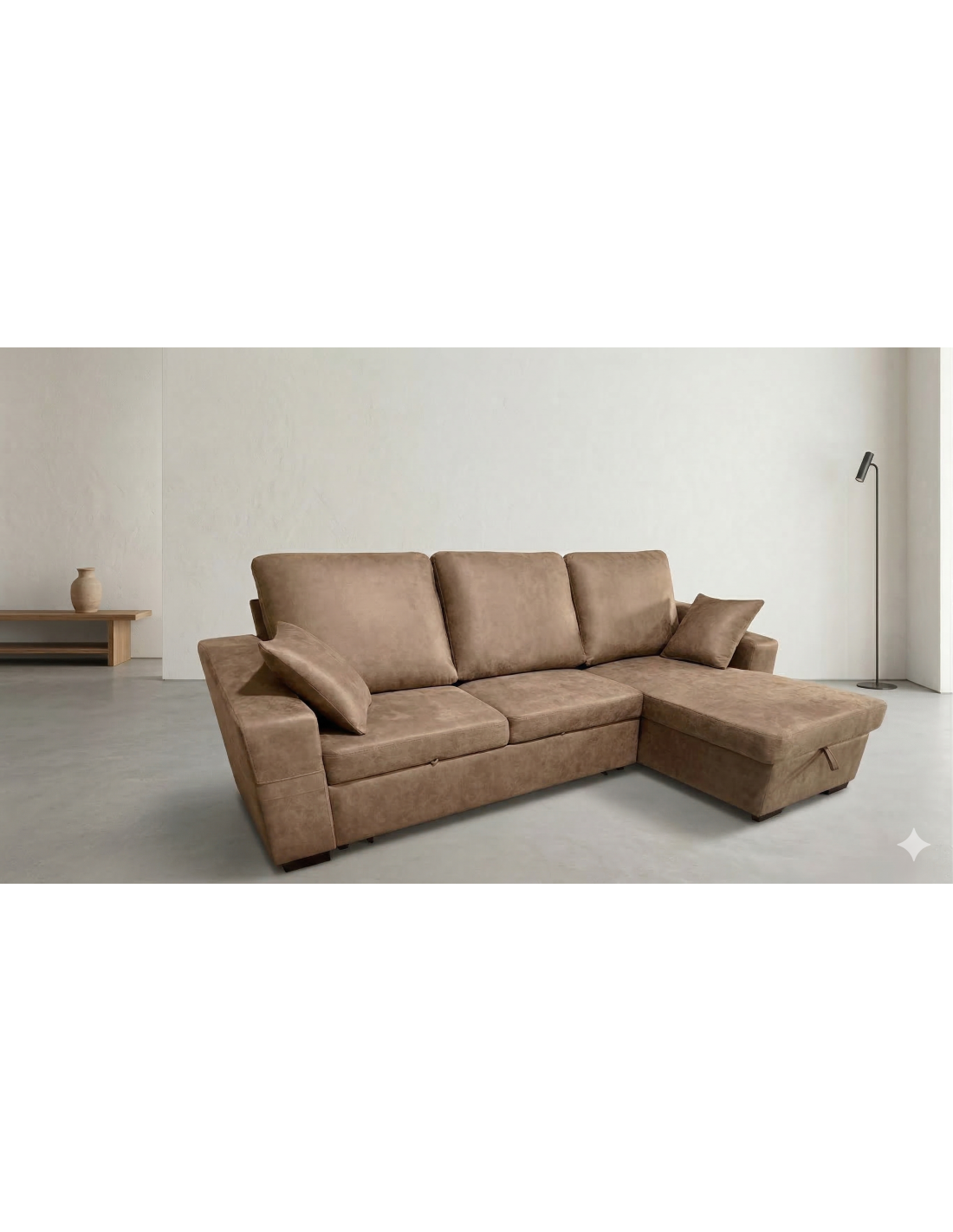 Optimización inteligente del espacio. Este sofá no solo destaca por su estética contemporánea, sino por su funcionalidad oculta: incluye un amplio arcón de almacenaje bajo la chaise longue para mantener el orden y un sistema de apertura rápida que lo transforma en una cómoda cama para invitados. Es la inversión perfecta para hogares dinámicos que valoran el estilo sin renunciar a la utilidad.