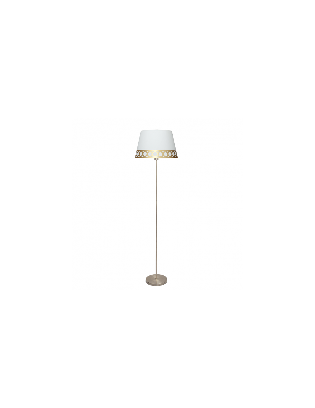 Pie de salón serie Dalia de color blanco/oro. Está realizado en metal y material textil, con cenefa decorativa de motivos circulares. La familia se puede completar con el colgante, sobremesa y lámpara de tres y dos luces. Posee un portalámparas E27.