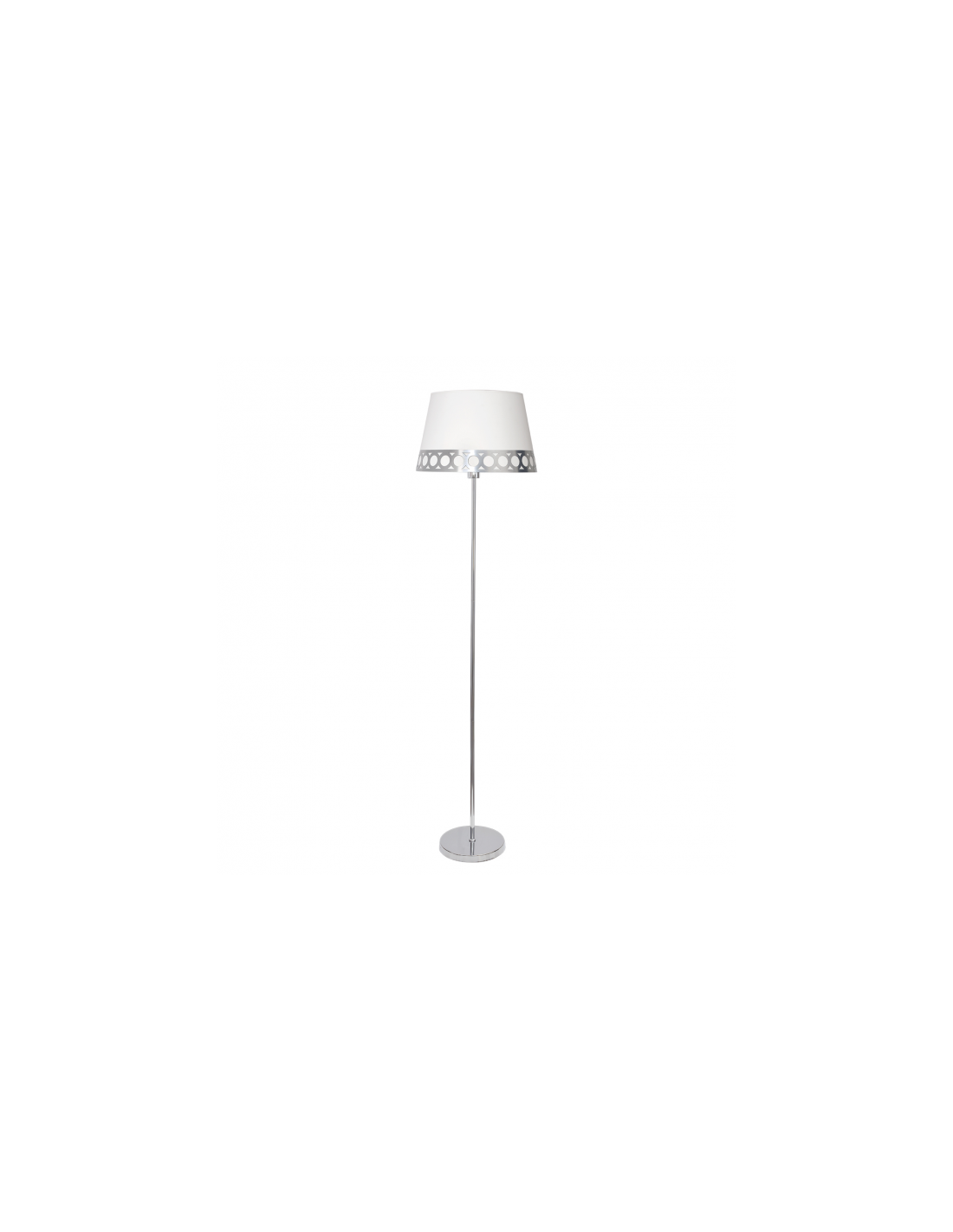 Pie de salón serie Dalia de color blanco/plata. Está realizado en metal y material textil, con cenefa decorativa de motivos circulares. La familia se puede completar con el colgante, sobremesa y lámpara de tres y dos luces. Disponible también color blanco/plata y beis/marrón. Posee un portalámparas E27.