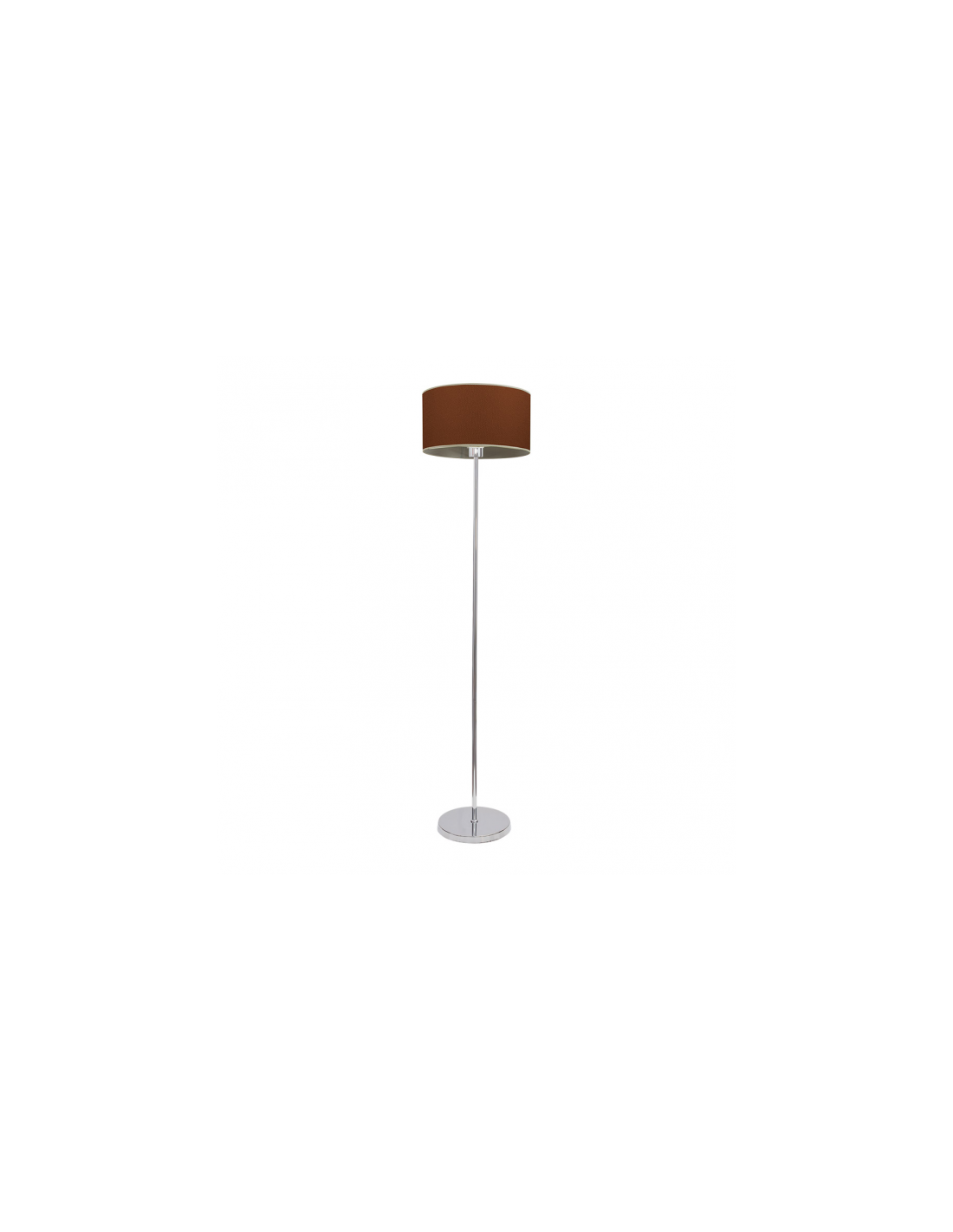 pie salón de estilo moderno con pantalla de 40 centímetros de diámetro, tela color caldera y portalampara E27, armazon de color cromo con base cuadrada y cable de conexión transparente. el peso del pie de salón es de 3370 gramos y sus medidas son 150x40x40.