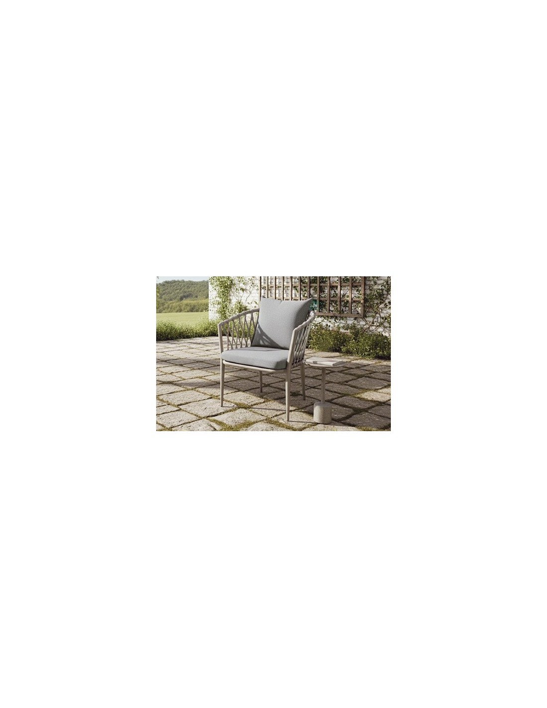 Sillón de exterior / interior Estructura en aluminio Respaldo decorativo trenzado en cuerda Cojines en tejido de poliéster gris Medidas: 57 x 60 x 77 cm - Unidad venta : caja 4 Uds - Volumen : 0 097 M 3 x Ud Entradas previstas : 296 Ud(s) - 15/04 Colores disponibles : Gris 296 Ud(s) - 15/04 Oak / Gris 284 Ud(s) - 15/04 296 Ud(s) - 15/04