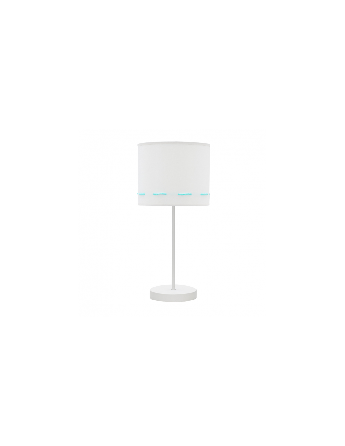 Sobremesa serie TRAZOS de color verde agua y armazón blanco. Su diámetro es de 17 cm y al igual que el colgante, juega con pequeños trazos de hilo de color. Posee un portalámparas E14.