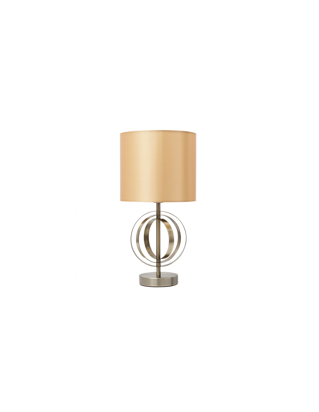 Sobremesa serie Alfena de color bronce. Realizado en metal y pantalla textil. El cuerpo del sobremesa se compone de tres círculos concéntricos y orientables que aportan gran belleza al conjunto. Sus dimensiones son 46x23x23 cm. El portalámparas es E27.