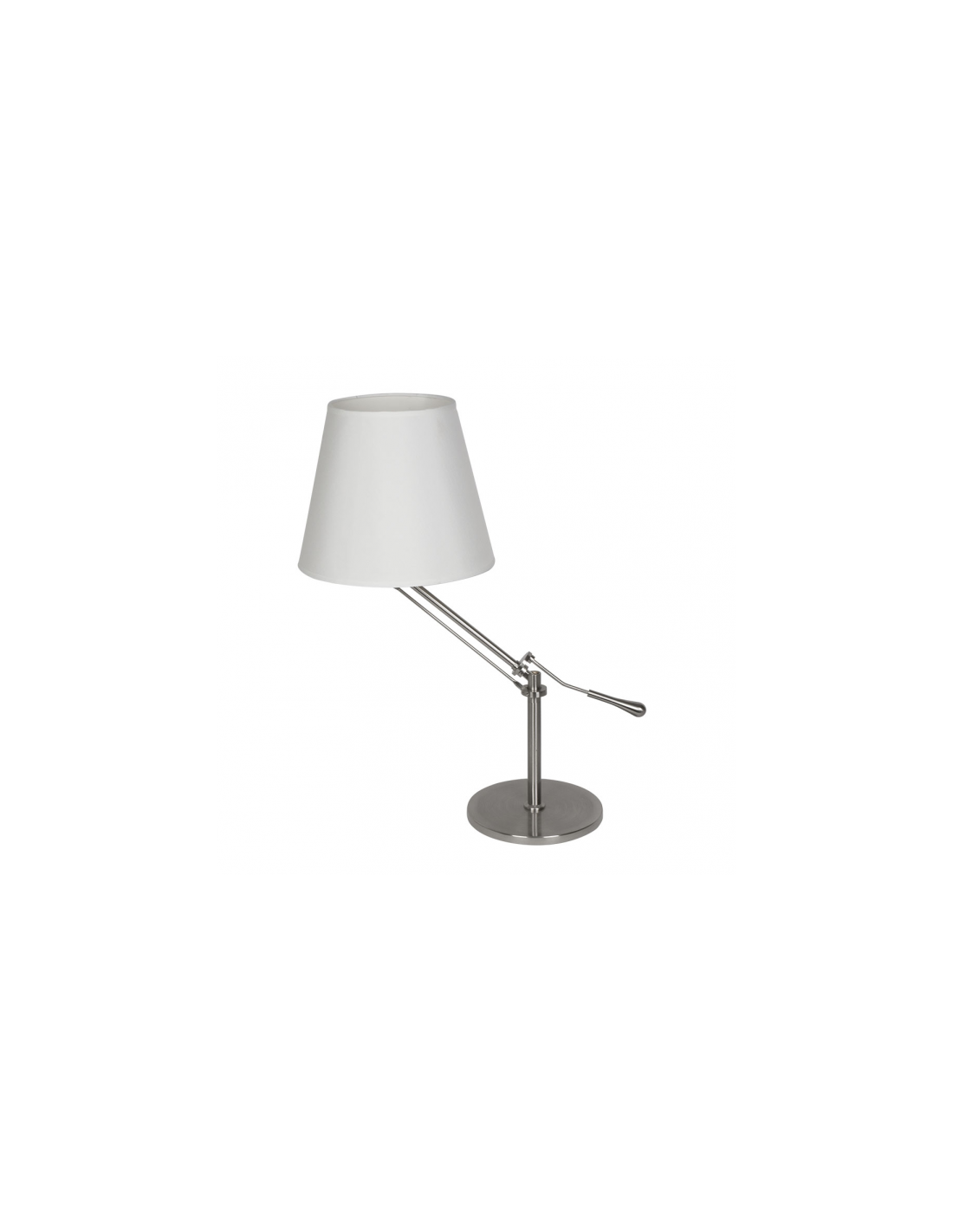 Sobremesa articulable Serie Arquímedes de color níquel con pantalla blanca. Realizado en metal y material textil. Puede completar la familia con el pie de salón a juego. sus dimensiones son 42X60X25 cm y el portalámparas E27.