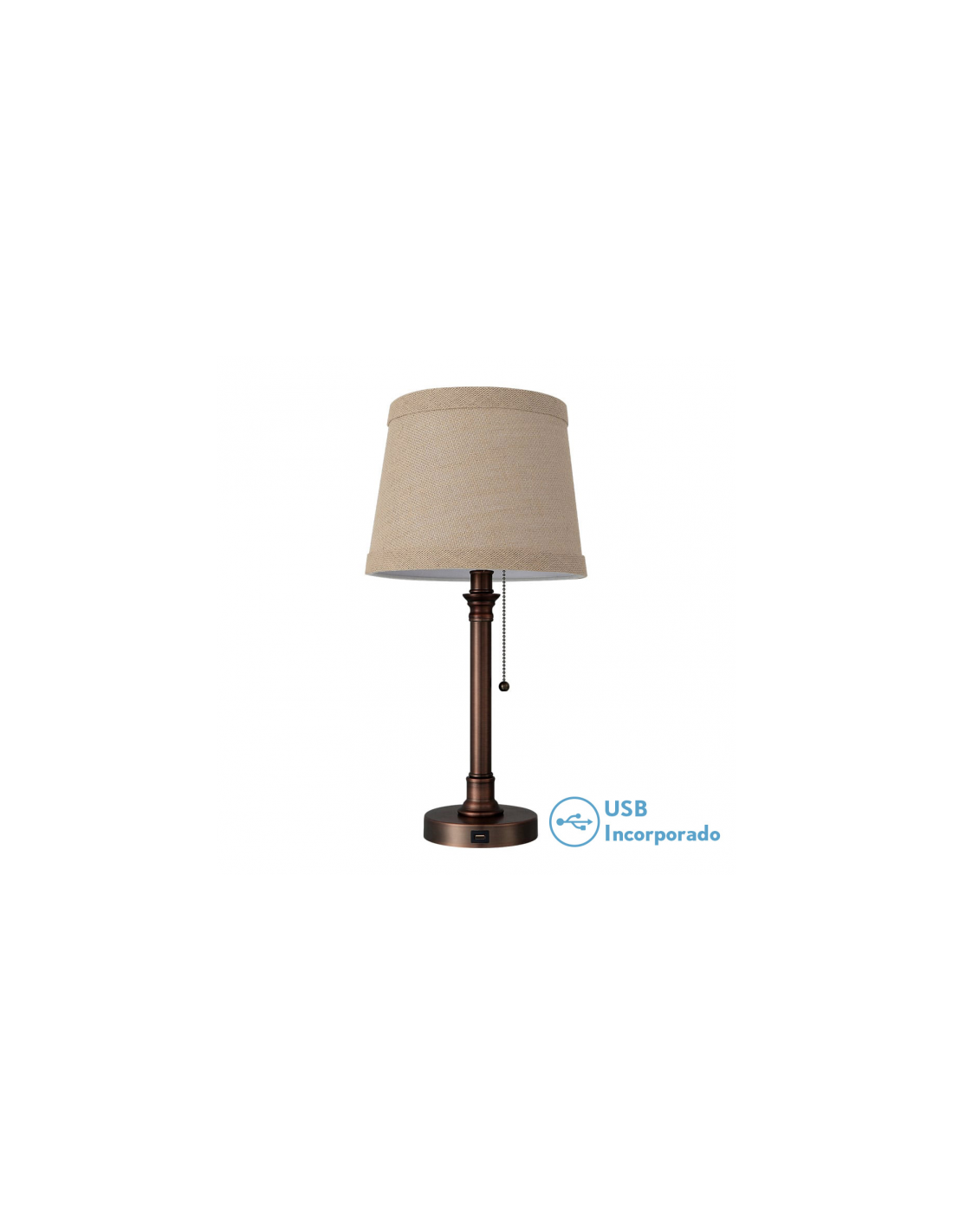 Sobremesa serie BIG BEN de color MARRÓN. Realizado en metal y material textil. Pantalla de diseño en lino beige sobre cuerpo de estilo clásico y formas elegantes para decorar e iluminar cualquier rincón de la casa. Sus dimensiones son 50X26X26 centímetros. Posee un portalámparas E27. Bombilla no incluida. Dispone de PUERTO USB. Modelo también disponible en Cuero y Níquel.