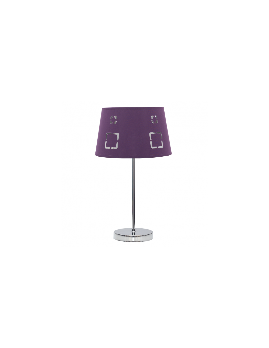 Sobremesa serie Celaya de color berenjena. Realizado en metal color cromo y material textil. La pantalla presenta un diseño con formas geométricas caladas que dejan pasar la luz. Sus dimensiones son 43x25x25 cm. Está disponible el colgante y pie de salón en color berenjena y varios colores. El portalámparas es E14.