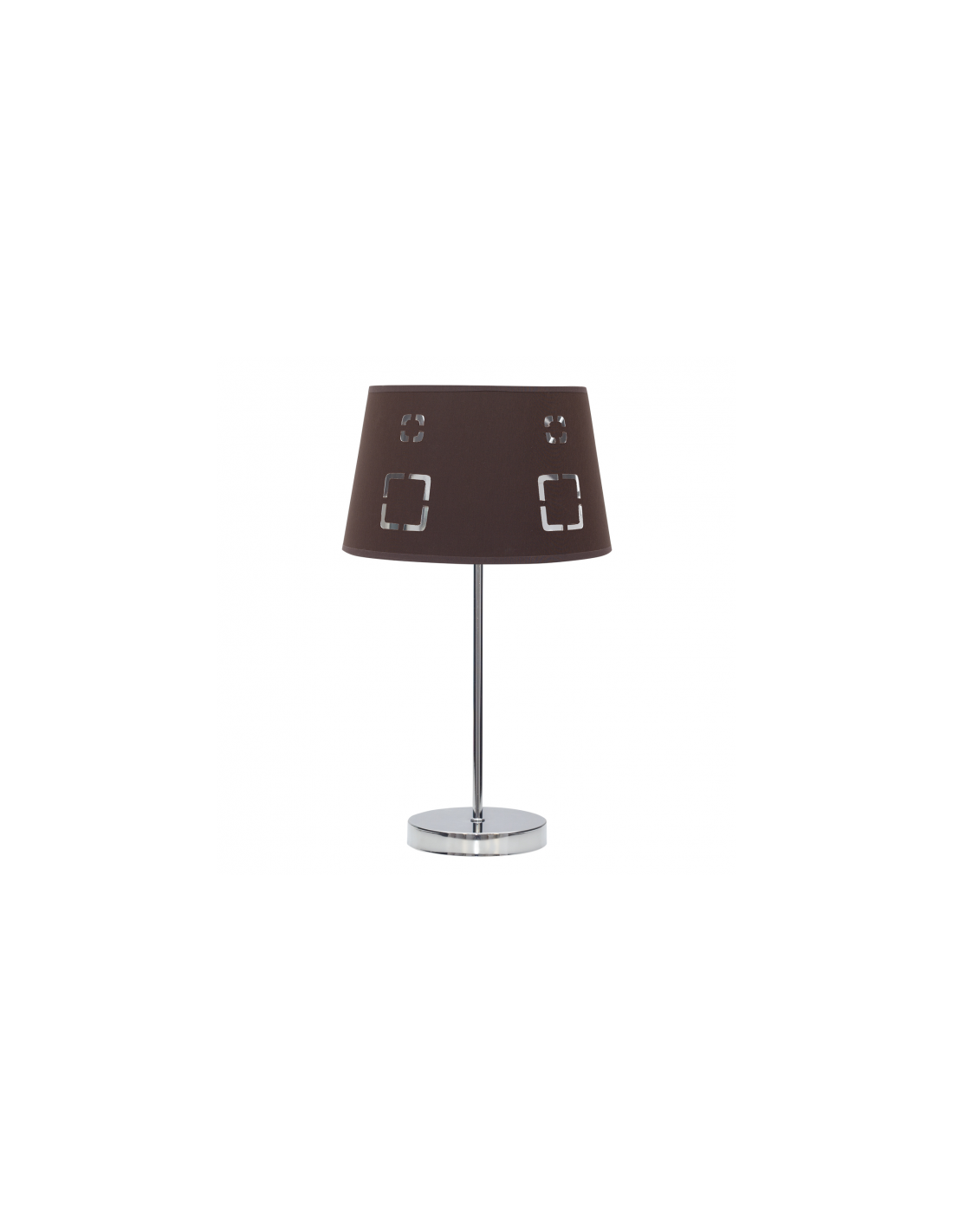 Sobremesa serie Celaya de color marrón. Realizado en metal color cromo y material textil. La pantalla presenta un diseño con formas geométricas caladas que dejan pasar la luz. Sus dimensiones son 43x25x25 cm. Está disponible el colgante y pie de salón en color marrón y varios colores. El portalámparas es E14.