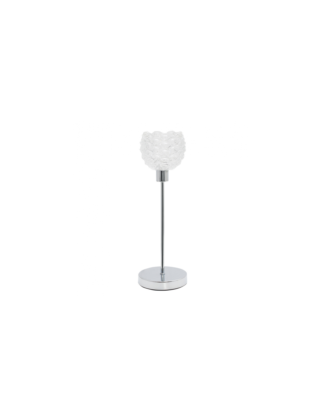 Sobremesa serie Coventry de color cromo. Realizado en metal, con tulipa de cristal tallado a modo de pétalos. Puede completar la decoración del hogar con la lámpara de tres y dos luces y el aplique en cromo. Está disponible también en color cuero, excepto el alique. El portalámparas es E14.
