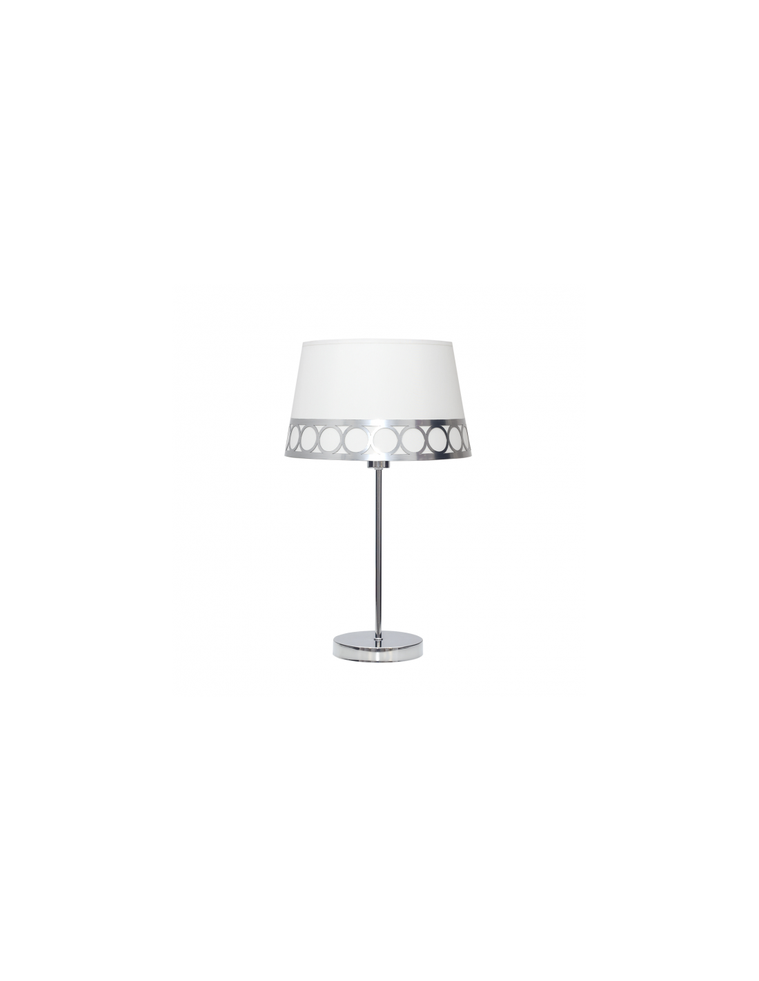 Sobremesa serie Dalia de color blanco/plata. Está realizado en metal y material textil, con cenefa decorativa de motivos circulares. La familia se puede completar con el colgante, pie de salón y lámpara de tres y dos luces. Disponible también en color blanco/oro. Posee un portalámparas E14.