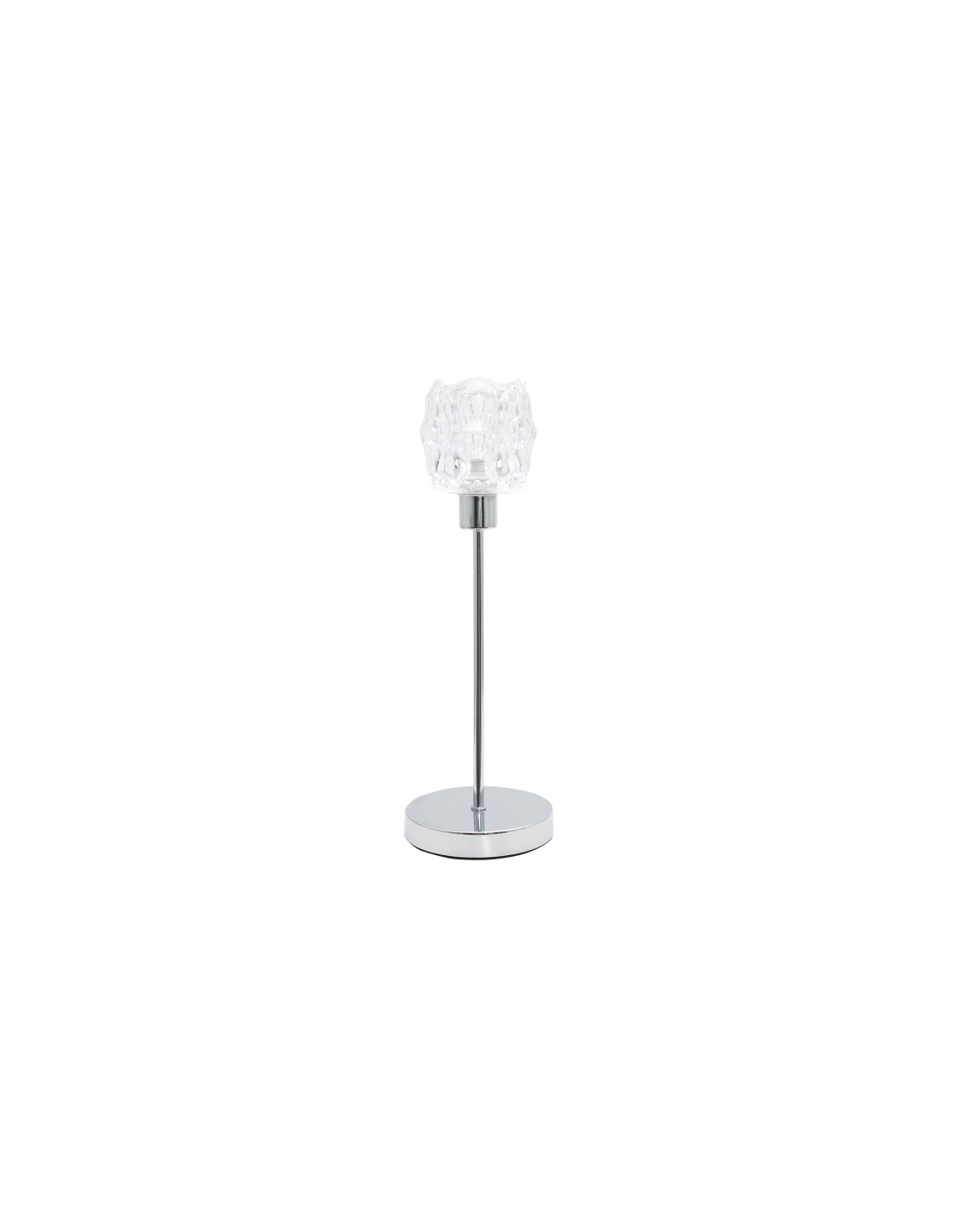 Sobremesa serie Derby de color cromo. Realizado en metal, con tulipa de cristal tallado que destaca por la singularidad que aporta al conjunto. La familia puede completarse con la lámpara de tres y dos luces, además del aplique en cromo. Disponible también en color cuero, excepto el aplique. El portalámparas es E14.
