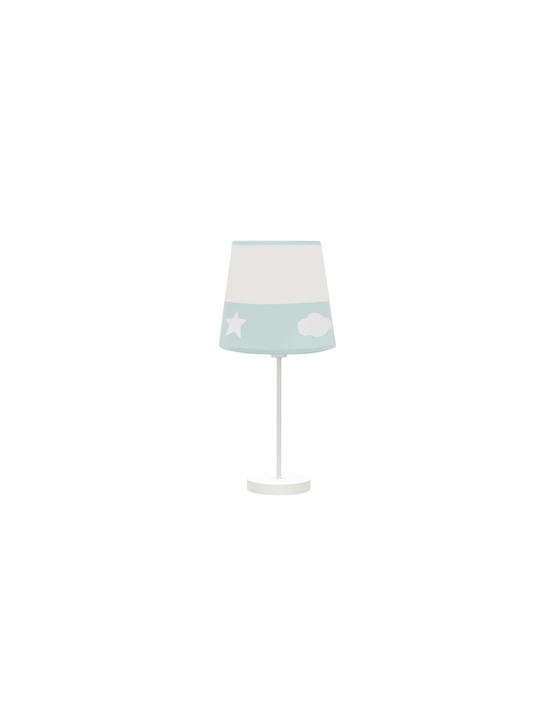Sobremesa serie Galaxia en color blanco/verde agua. Realizado en material textil. Portalámparas E14. Su diámetro es de 20 cm. Su diseño presenta una cenefa de color celeste decorada con motivos de estrellas y nubes. Disponible en rosa, piedra, lila y celeste.