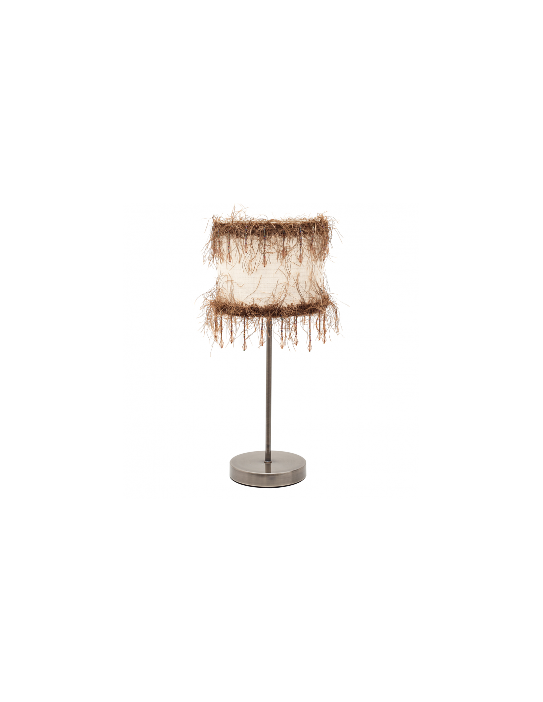 Sobremesa serie Hilos de color beis. La pantalla se caracteriza por una decoración de pasamanería de color ocre, creando así un contraste entre detalle y tejido. Es perfecto para ambientar espacios con cierto toque vintage. Se puede completar la serie con el colgante de 50 y 40 cm en color beis. Posee un portalámparas E14.