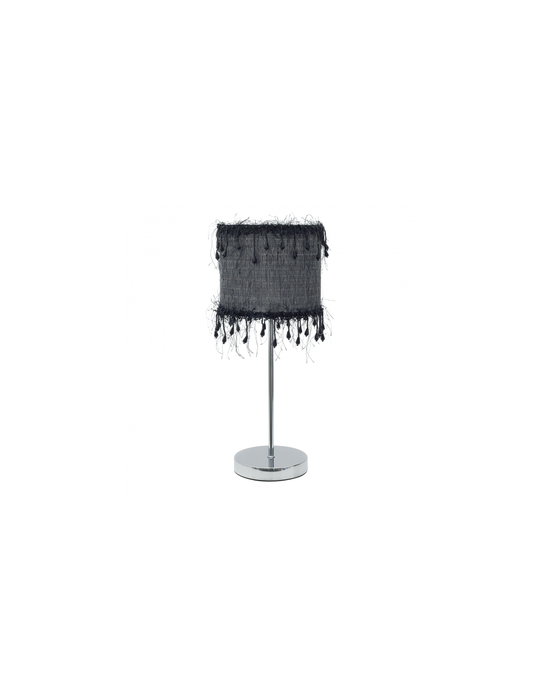 Sobremesa serie Hilos de color negro. Se caracteriza por una decoración de pasamanería de color negro en la pantalla. Es perfecto para ambientar espacios con cierto toque vintage. Se puede completar la serie con el colgante de 50 y 40 cm en color beis. Portalámparas E14.