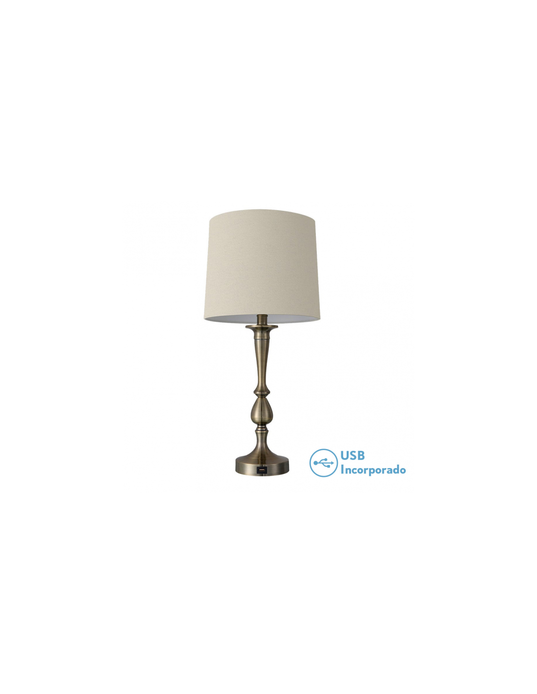 Sobremesa serie KHALIFA de color CUERO. Realizado en metal y material textil. Destaca su diseño clásico y elegante con pantalla de diseño de color beige. Sus dimensiones son 60´5X28X28 cm. Posee un portalámparas E27. Bombilla no incluida. Dispone de PUERTO USB. Modelo también disponible en Níquel y Marrón.