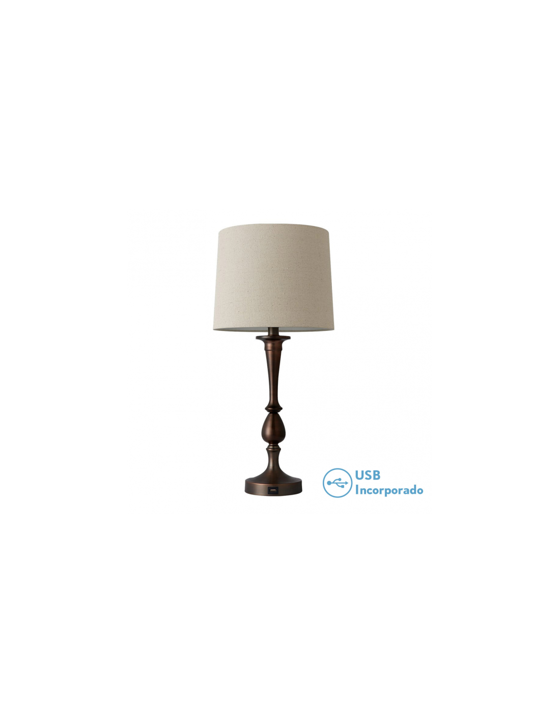 Sobremesa serie KHALIFA de color MARRÓN. Realizado en metal y material textil. Destaca el cuerpo de estilo clásico y formas elegantes con pantalla de lino beige para decorar e iluminar cualquier rincón de la casa. Sus dimensiones son 60´5X28X28 cm. Posee un portalámparas E27. Bombilla no incluida. Dispone de PUERTO USB. Modelo también disponible en Cuero y Níquel.