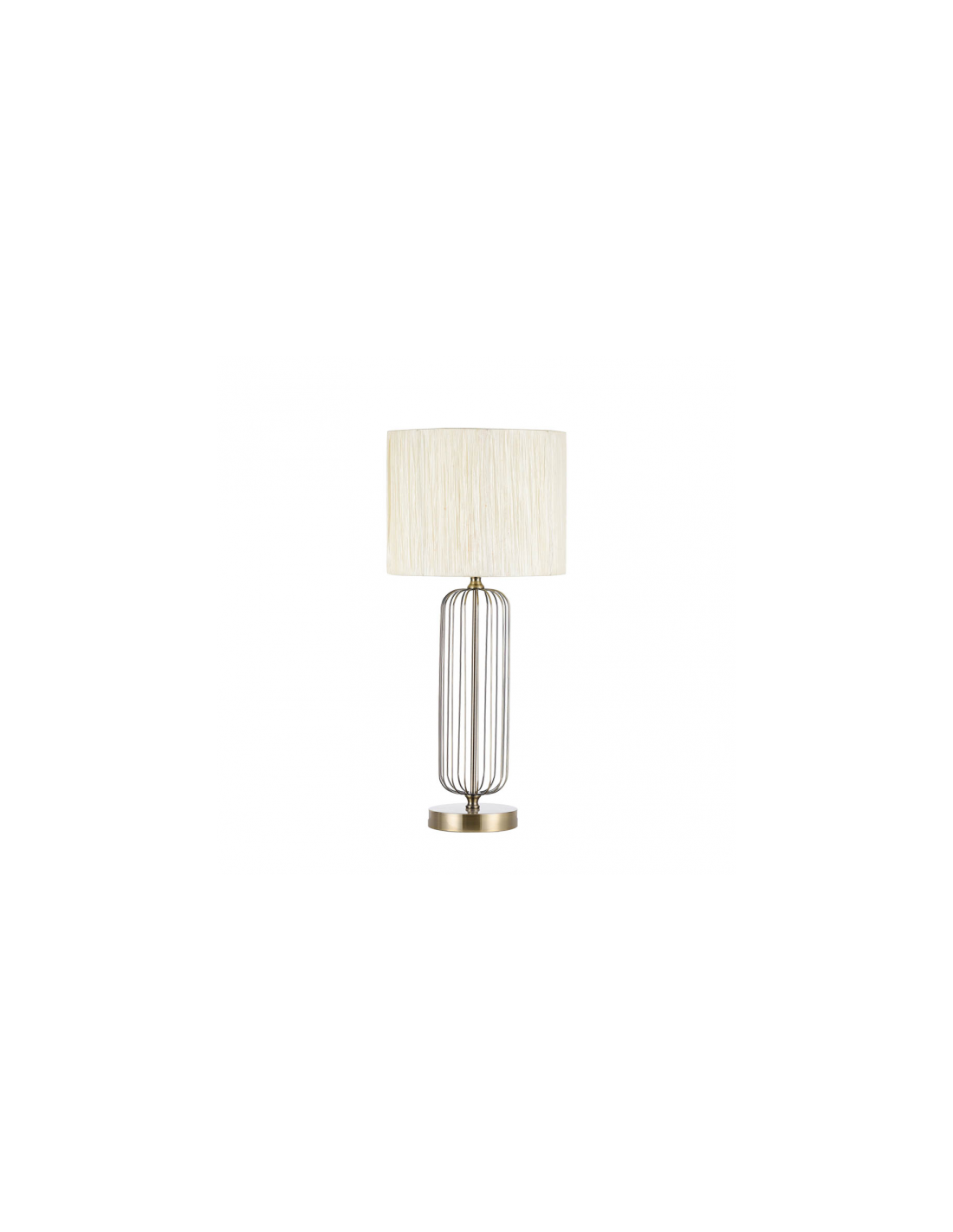 Sobremesa serie Mansonia de color CUERO realizada en metal con pantalla textil tipo bambula Beis. De diseño moderno y elegante para decorar e iluminar cualquier estancia. Sus dimensiones son 66x30x30 cm. El portalámparas es E27. Bombilla no incluida. Está disponible también en color Cromo con pantalla Blanca.
