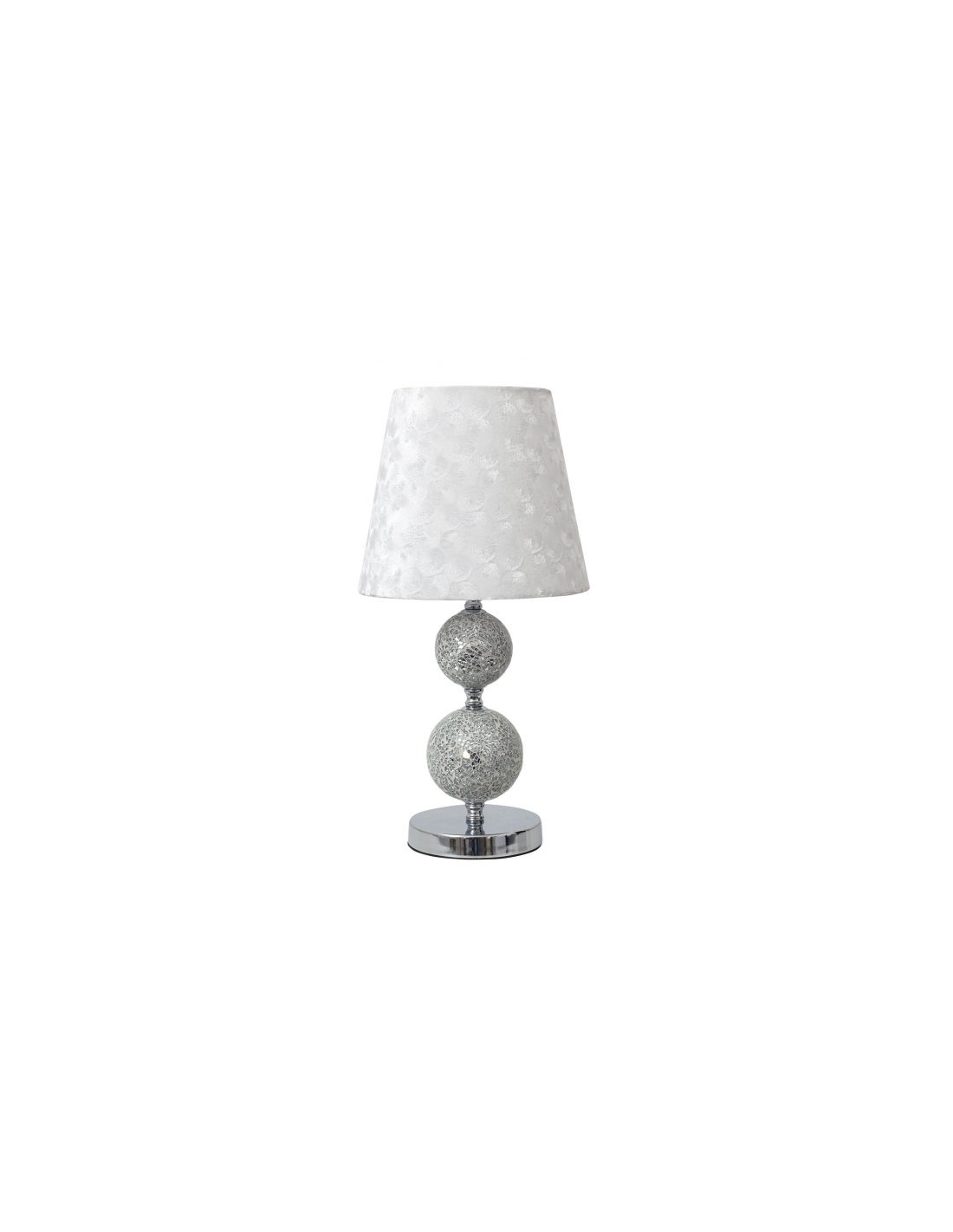 Sobremesa serie Mendoza de color cromo. Realizado en metal, cristal y material textil de color blanco. Este sobremesa se caracteriza por un diseño muy original que le aporta las bolas de pequeños cristales del armazón. La pantalla también es de gran originalidad ya que imita el efecto nacarado. Sus dimensiones son 50x25x25 cm y está disponible en color cuero también. El portalámparas es E14. Si quiere completar la familia puede adquirir el aplique, lámpara de ocho luces, cinco luces y de tres luces en color cromo.