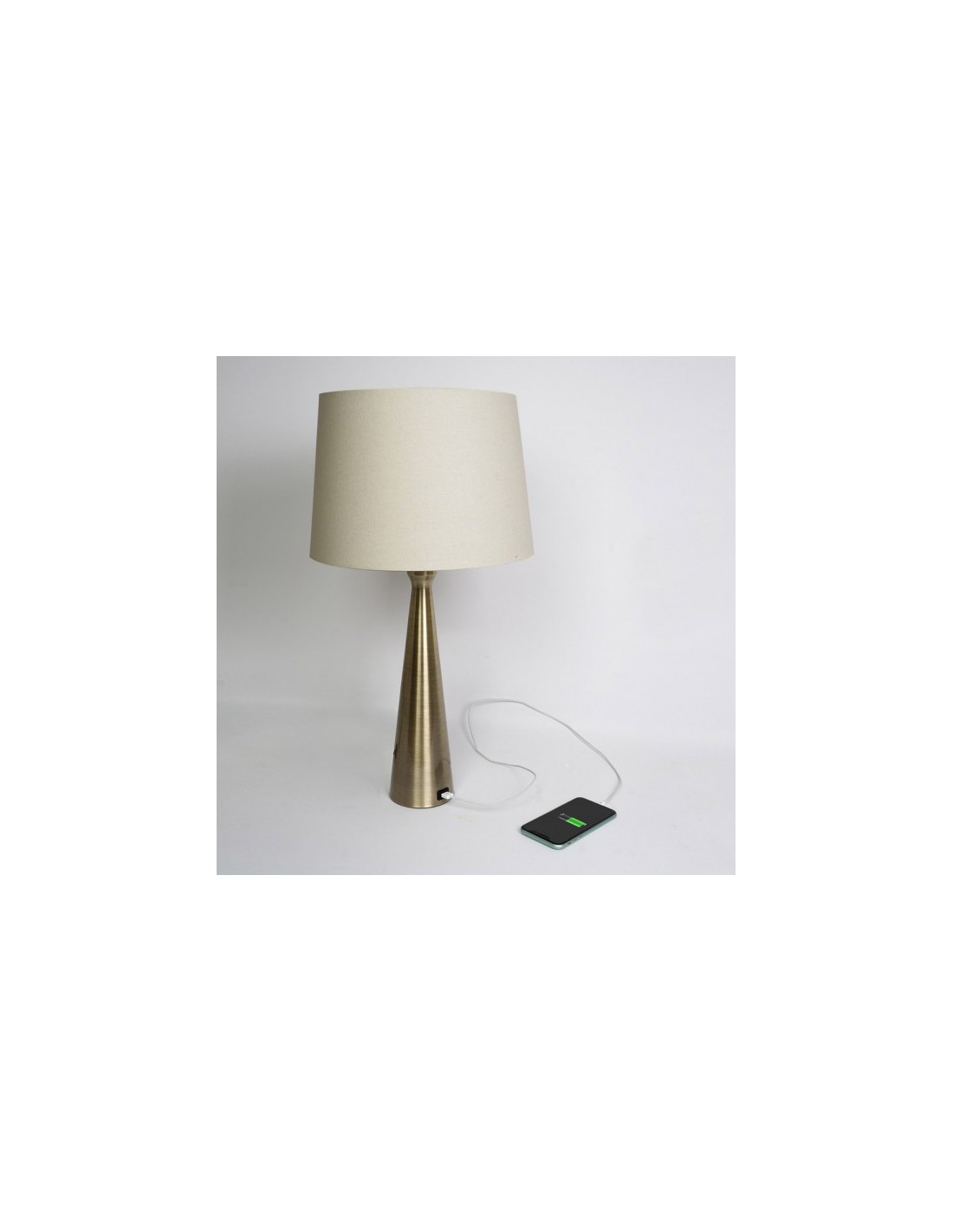 Sobremesa serie PEARL de color CUERO. Realizado en metal y material textil. Pantalla de diseño en lino beige sobre cuerpo de estilo clásico y formas elegantes para decorar e iluminar cualquier rincón de la casa aportándole personalidad y sofisticación a la estancia. Sus dimensiones son 61X33X33 centímetros. Posee un portalámparas E27. Bombilla no incluida. Dispone de PUERTO USB. Modelo también disponible en Níquel y Marrón.