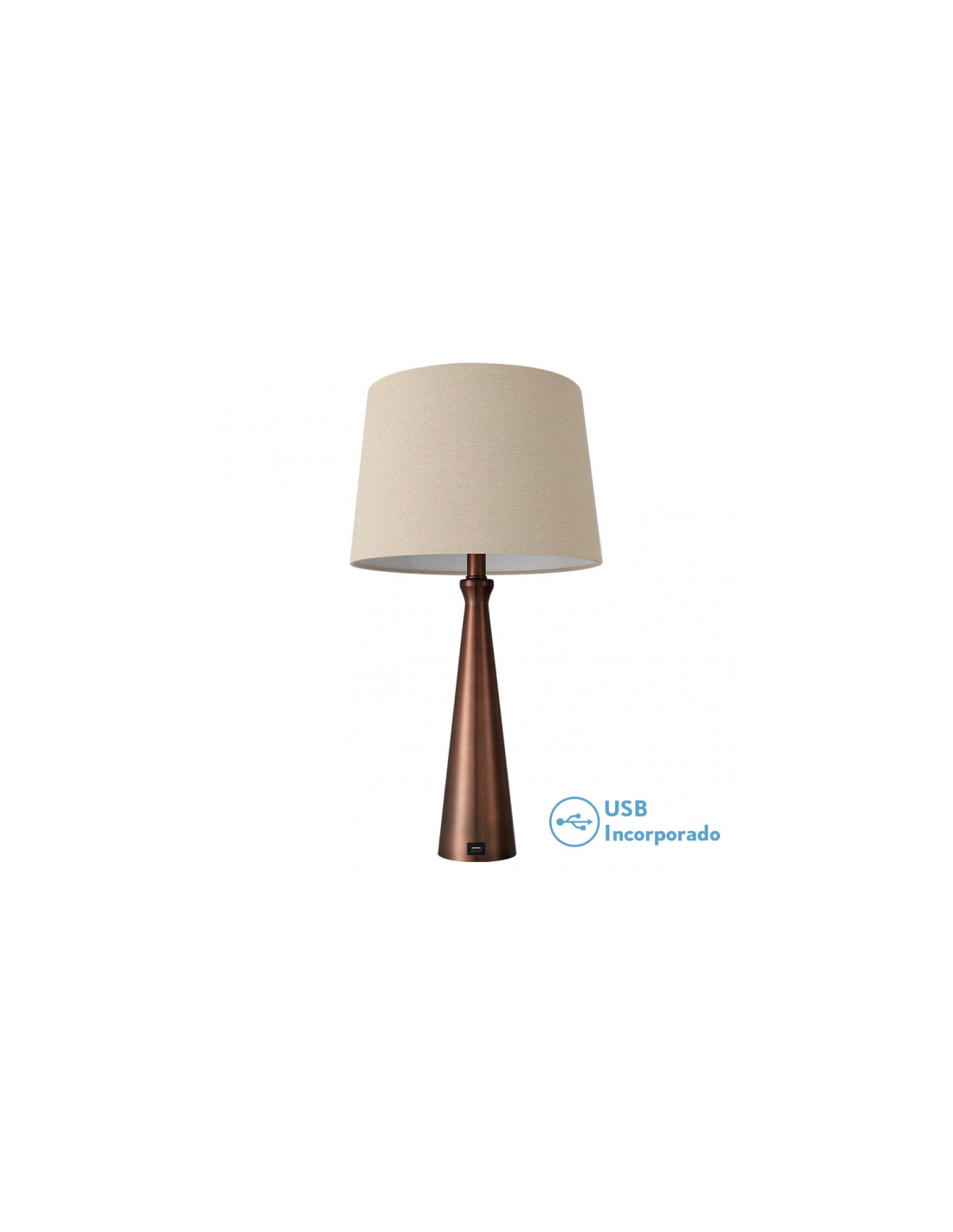 Sobremesa serie PEARL de color MARRON. Realizado en metal y material textil. Pantalla de diseño en lino beige sobre cuerpo de estilo clásico y formas elegantes para decorar e iluminar cualquier rincón de la casa aportándole personalidad y sofisticación a la estancia. Sus dimensiones son 61X33X33 centímetros. Posee un portalámparas E27. Bombilla no incluida. Dispone de PUERTO USB. Modelo también disponible en Cuero y Níquel.