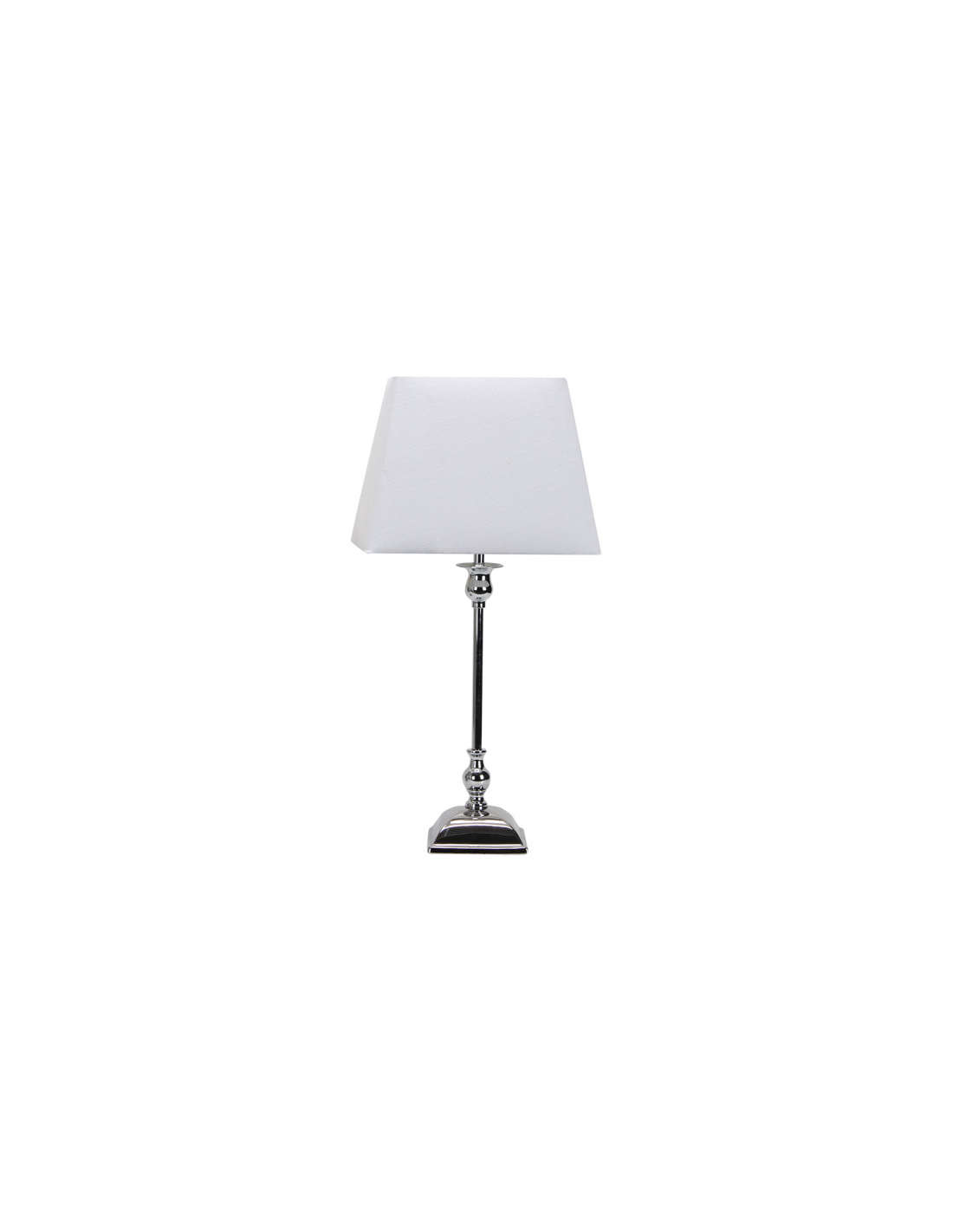Sobremesa serie Percasol en color CROMO de estilo clásico, sencillo y elegante con pantalla cuadrada Blanca. Portalámparas E27. Bombilla no incluida. Tiene una medida de 52X25X25 centímetros. Modelo también disponible en color Marrón Rústico/Beis.