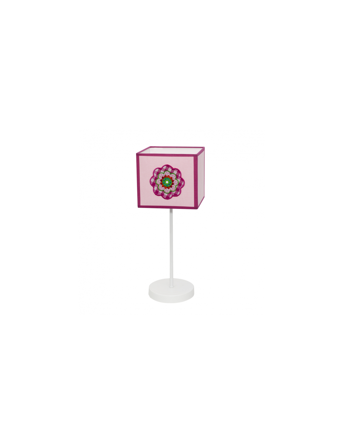 Sobremesa infantil serie Pétalo de color rosa. Se caracteriza por tener una forma cuadrada y un motivo bordado en forma de flor. Posee un portalámparas E14. Su material es textil. Puede completar la serie con el colgante también en color rosa.