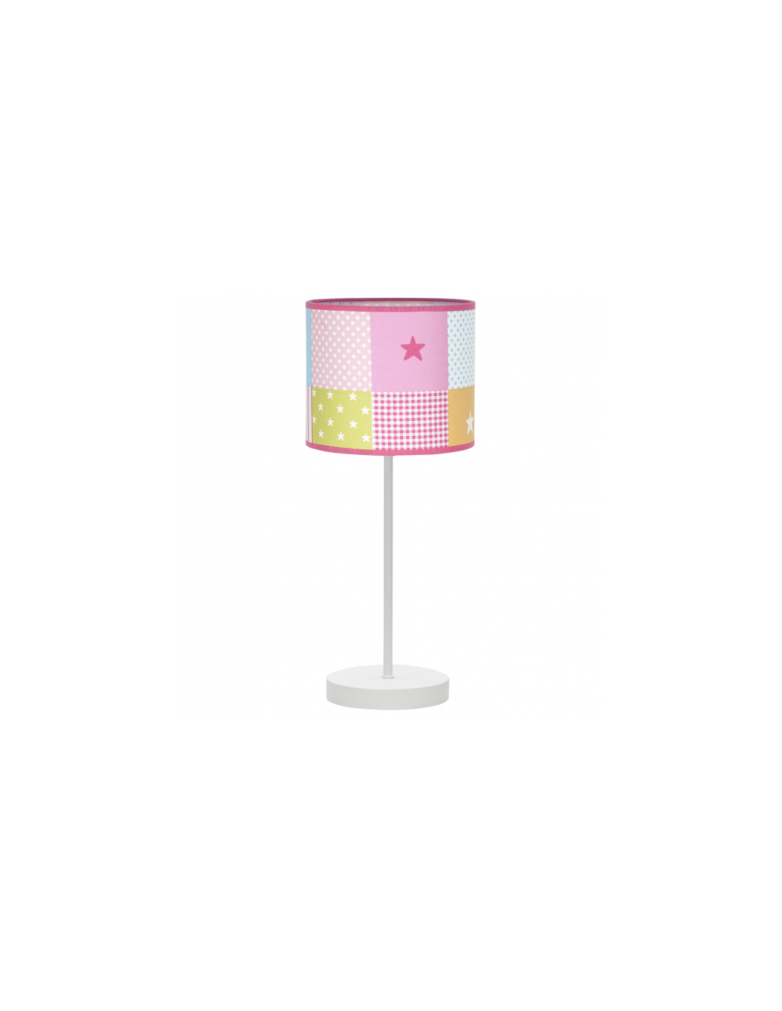 Sobremesa de estilo infantíl con pantalla ciíndrica de 17 centímetros de diámetros de cuadros de colores y portalámpara E14, armazón de metal en blanco con base redonda y cable de conexión en blanco. el peso del sobremesa es de 850 gramos y con una altura de 41 centimetros. las dimensiones del embalaje son de 34x20x20.