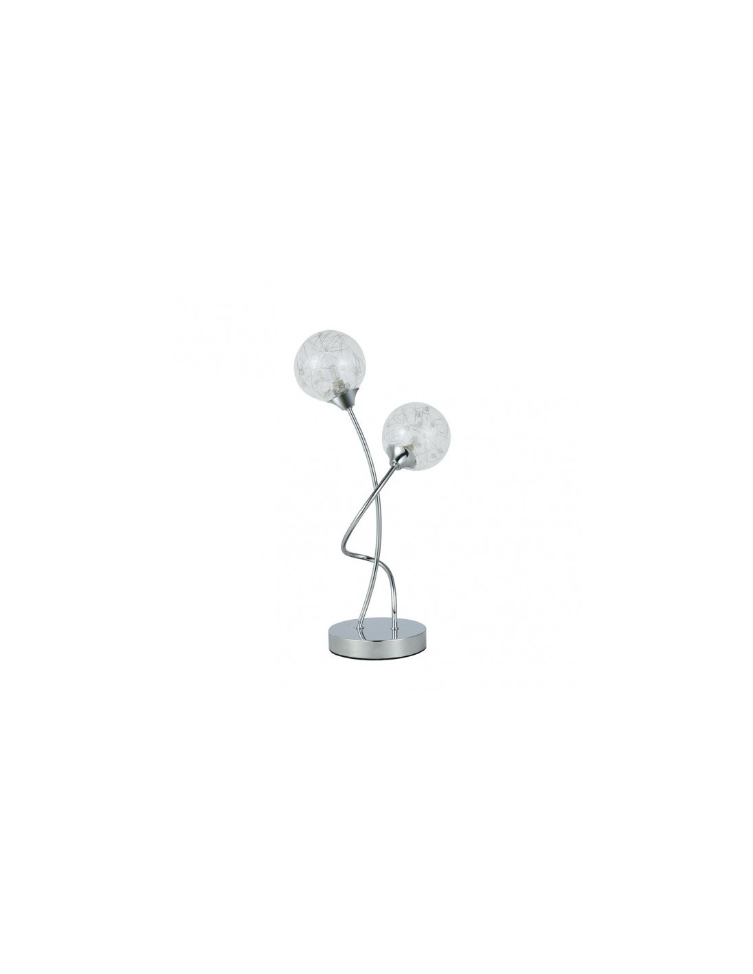 Sobremesa de dos luces serie RIO DE JANEIRO, realizada en metal color CROMO y tulipas de cristal y metal. Diseño moderno y muy original, resaltando además de su forma sus tulipas, dónde el cristal transparente deja ver el entresijo de hilos metálicos con pequeñas lágrimas de cristal de su interior, resultando una composición muy especial para decorar cualquier rincón tanto en salones como en dormitorios con un toque muy personal. Tiene una dimensión de 45x24x14 centímetros y un peso neto 1010 gramos. Posee dos porta lámparas G9. Bombillas no incluidas. Puede completar la decoración de su hogar con la lámpara de tres luces y la lámpara de cinco luces. Disponibles también en color cuero.