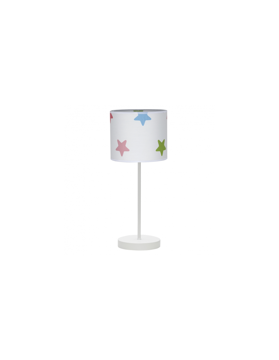 Sobremesa de estilo infantíl con pantalla ciíndrica de 17 centímetros de diámetros decorado con estrellas de colores y portalámpara E14, armazón de metal en blanco con base redonda y cable de conexión en blanco. El peso del sobremesa es de 860 gramos y con una altura de 41 centimetros. las dimensiones del embalaje son de 34x20x20.